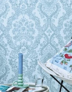 Barock kann so leicht, frei und reizvoll detailliert sein – Barocktapete Nuria in einer Farbkombination aus Blassblau und Pastellblau eröffnet besondere Überraschungsmomente für das Auge. Kunstvoll setzen sich die Ornamente aus floralen und maritimen Elementen, darunter Segelschiffe und Schwäne, zusammen und bilden ein sanftes großes Barockmuster für edle Raumstyles.