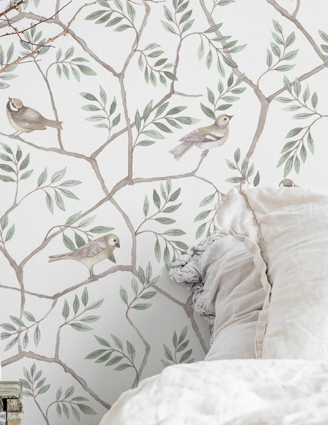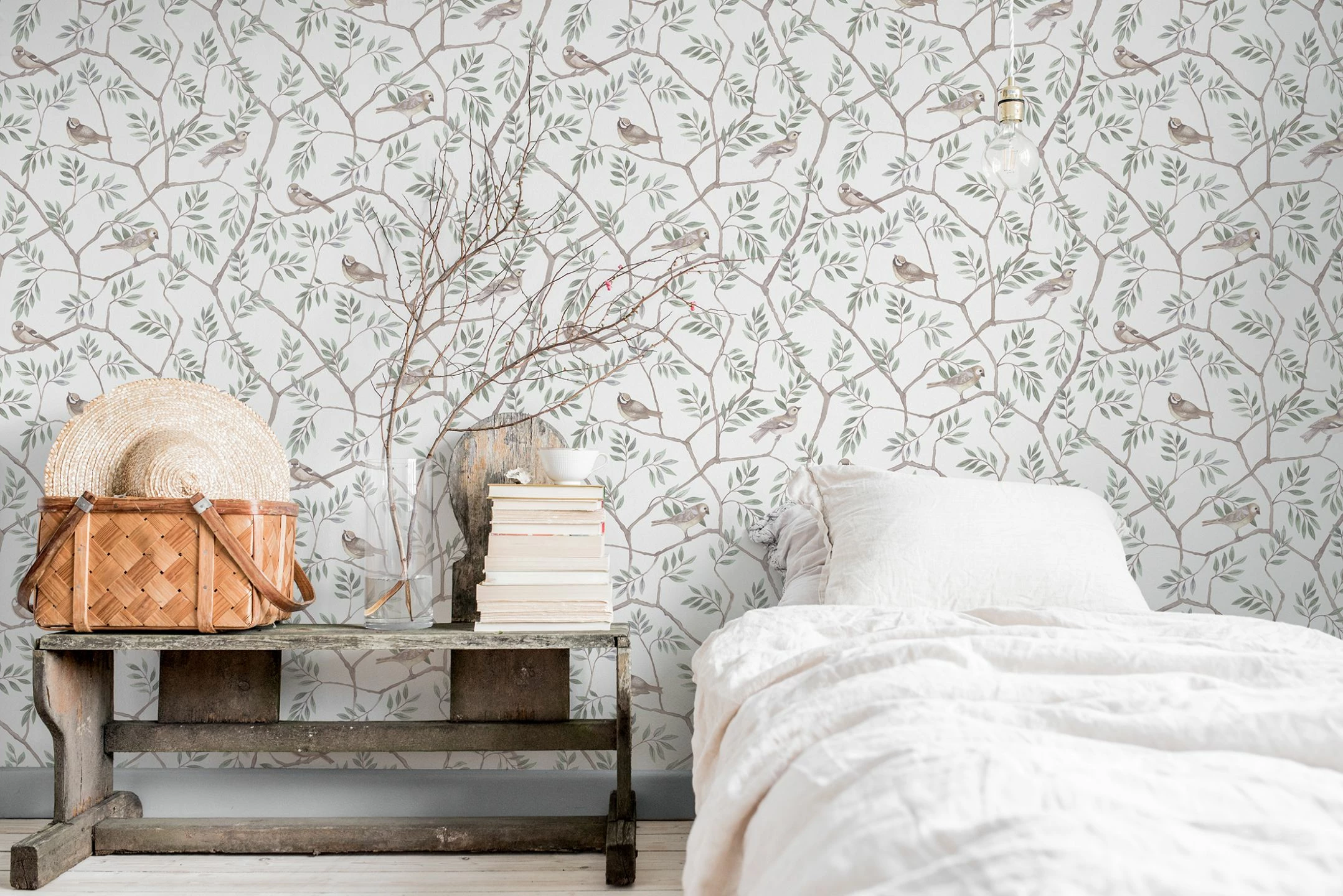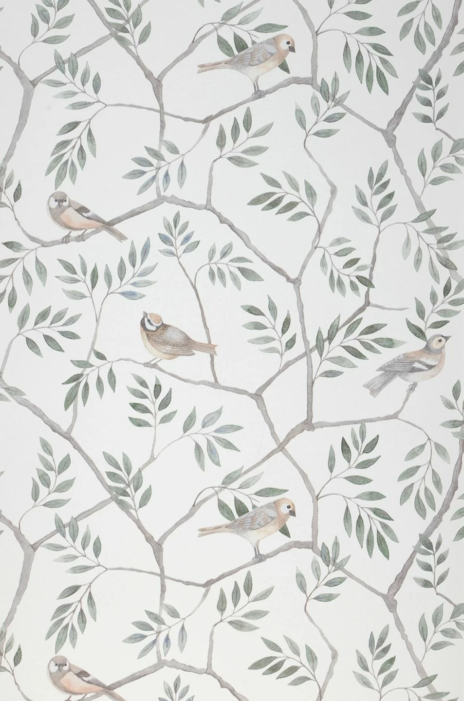 Wunderschön zart wie mit Aquarellfarben gemalt, naturgetreu und mit großer Liebe zum Detail dargestellt sind die Singvögel auf den Zweigen. Beinahe meint man, das morgendliche Konzert der Vogelstimmen zu hören! Die zarten Farbtöne auf dem weißen Grund verleihen der Tapete Leichtigkeit und Luftigkeit. Ein helles Schlafzimmer oder ein gemütliches Wohnzimmer erhalten durch „Operla“ individuellen, naturnahen Charme.