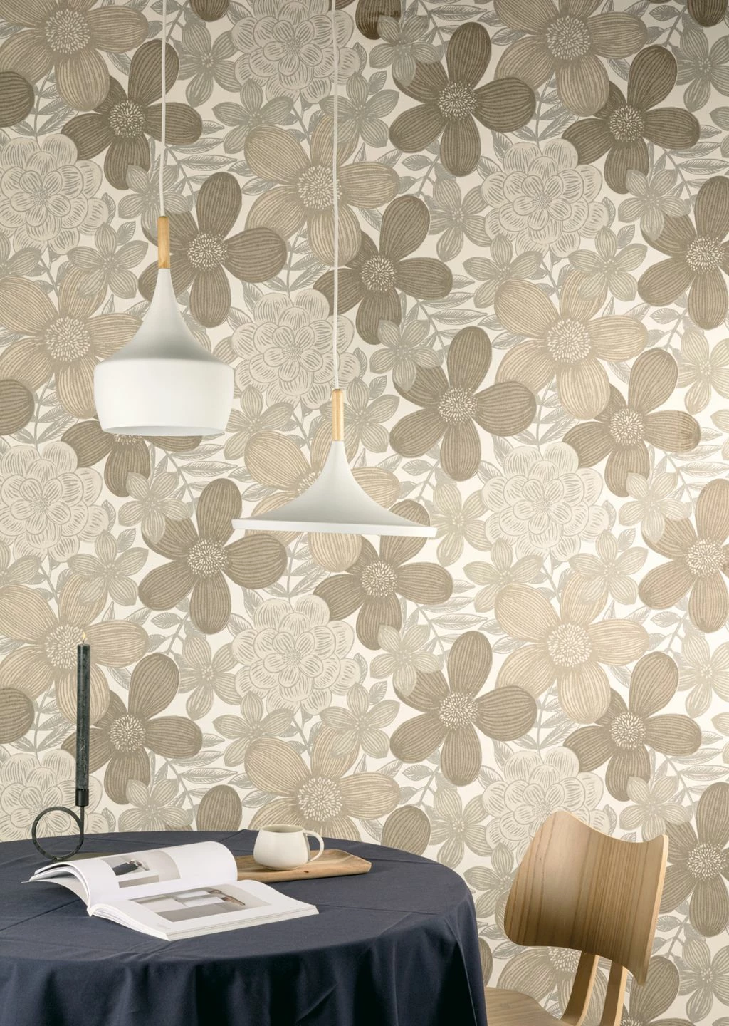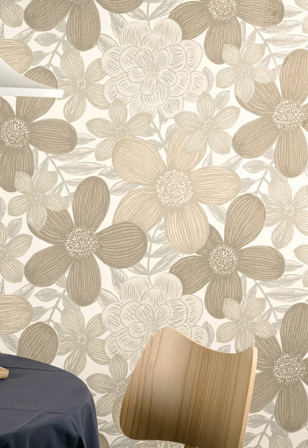 Die Konzentration auf wenige zueinander passende Farben – helle Braungrau- und Grautöne – rückt die üppigen Formen der großen Blüten ganz in den Mittelpunkt der Aufmerksamkeit. Bis ins kleinste Detail zu Ende gedacht ist das Farbkonzept. Durch die Kombination hellerer und dunklerer Töne in der Schraffur der Blütenblätter wirken diese plastisch und lebendig. Die Vliestapete strahlt Harmonie aus und ist der perfekte Hintergrund für eine Vielzahl von Kombinationsmöglichkeiten.