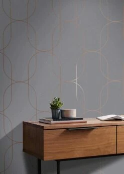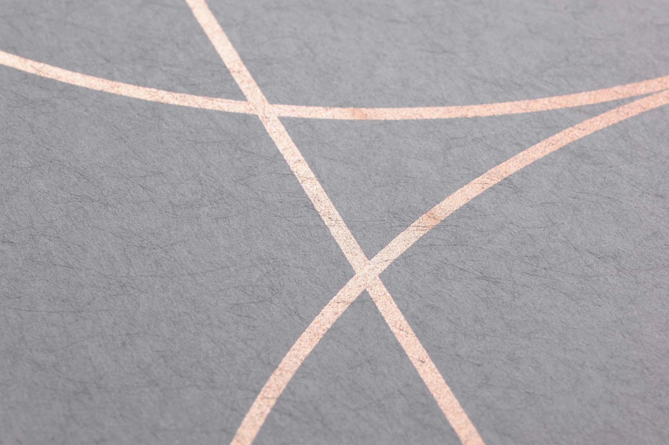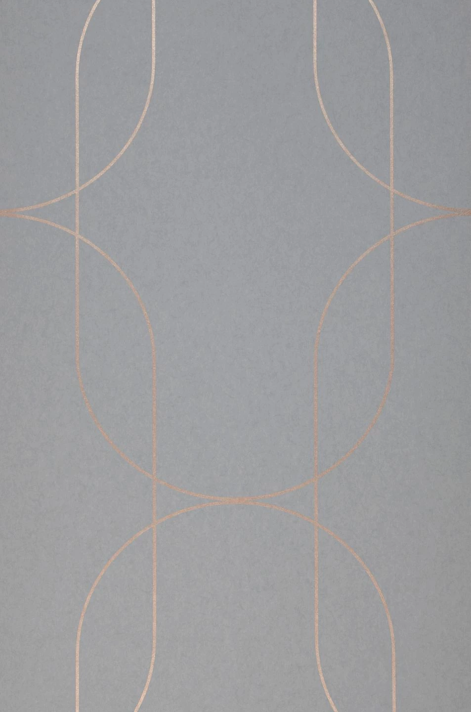 Art Deco in Perfektion: Klare, feine Linien in einem raffinierten, schimmernden Roségold auf einem Untergrund, der in einem sanften Hellgrau gehalten ist. Die goldenen Linien formen sich überschneidende Ovale und erzeugen ein großflächiges, dezentes Muster. Die Ästhetik des Art Deco verströmt eine zeitlos elegante Atmosphäre – egal ob in einem repräsentativen Wohnzimmer, in einem sachlich-schlichten Büro oder in einem Schlafzimmer.