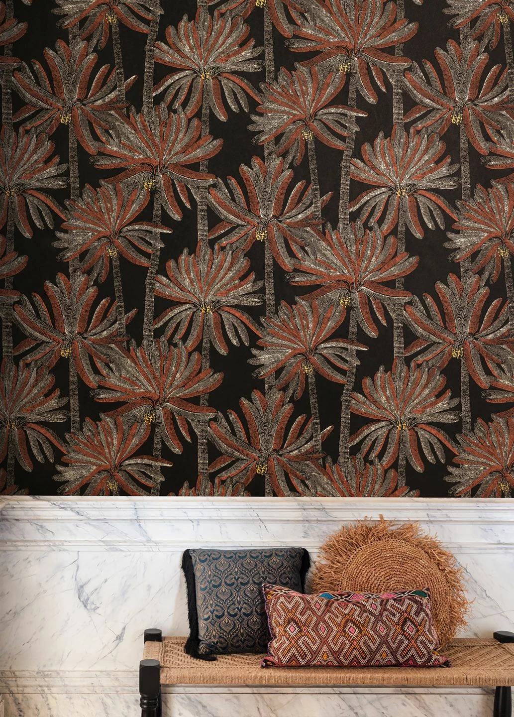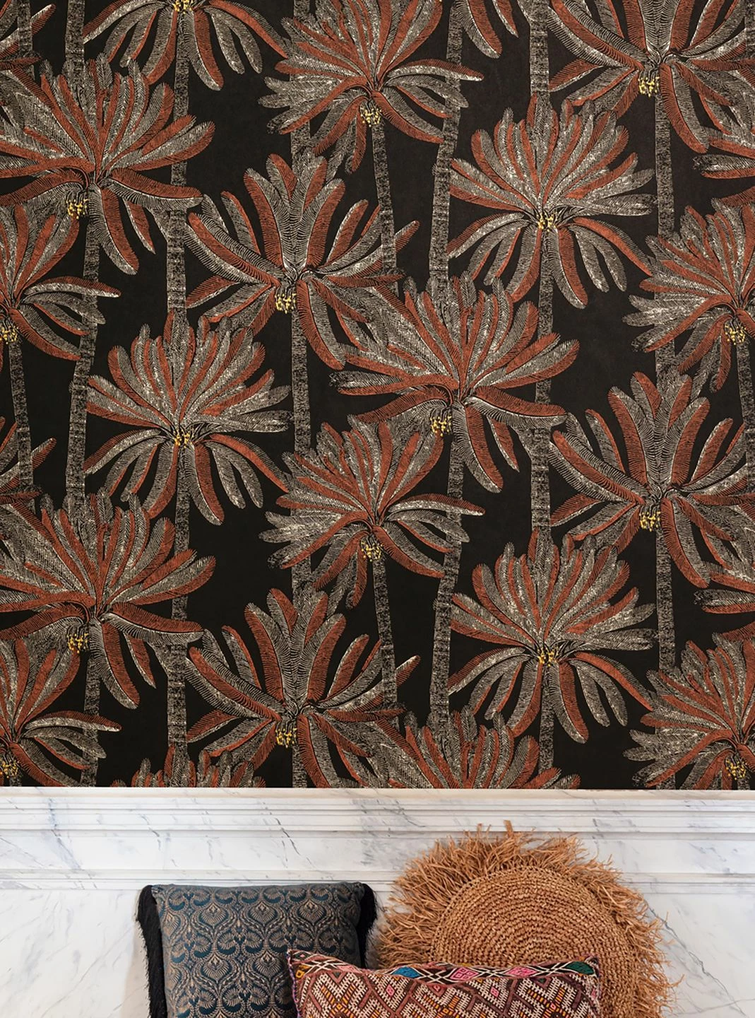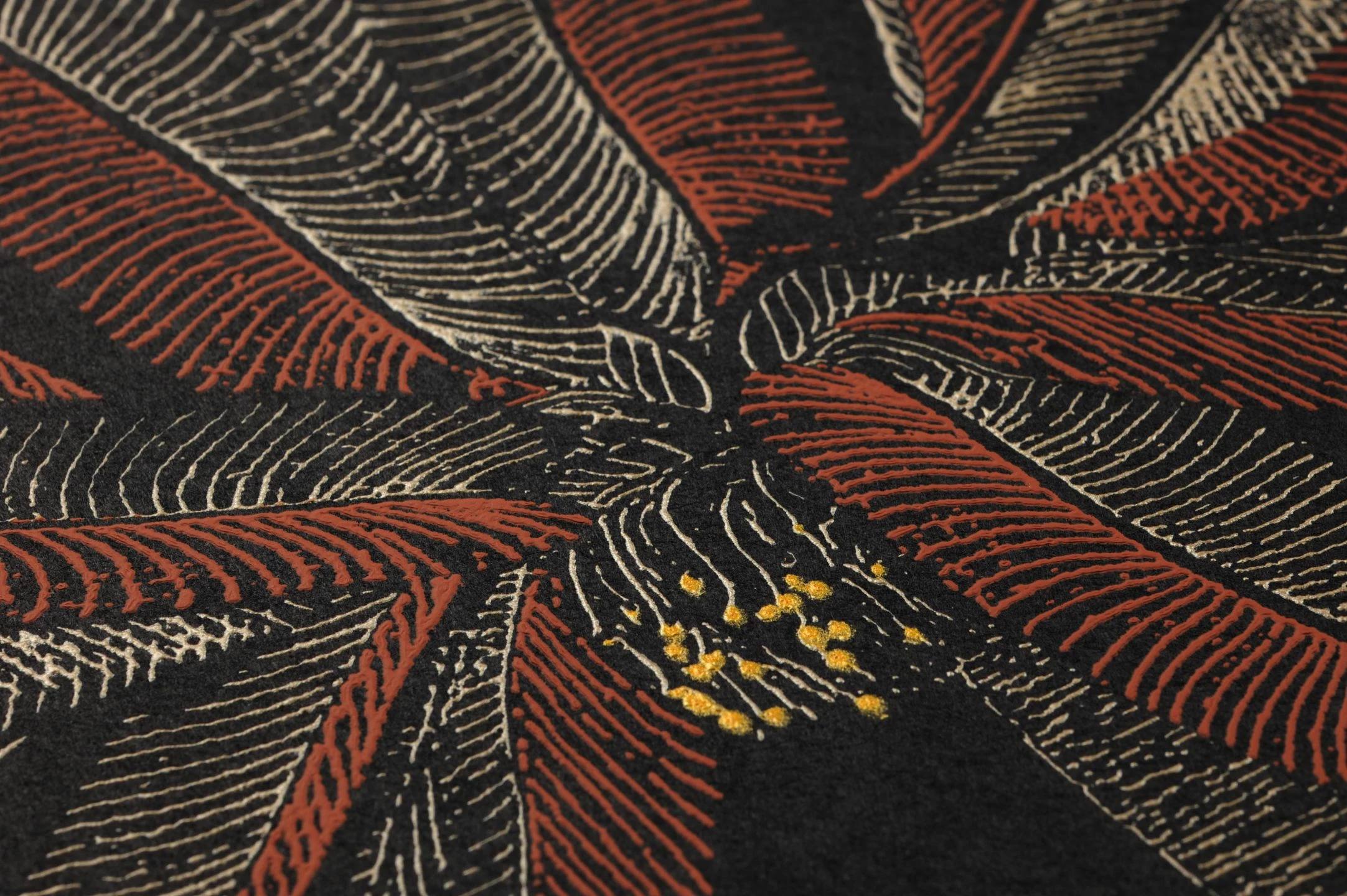 Ganz aus feinen Schraffuren setzen sich die Palmen auf der Vliestapete Palm Springs zusammen. Das macht sie leicht und luftig auf dem schwarzen Grund und betont die Struktur ihrer geraden Stämme und die feinen Verästelungen ihrer Blätter. Das warme Kupferrot und das helle Perlbeige scheinen auf dem dunklen Hintergrund zu glühen. Hier erhält das Palmen-Motiv eine ganz eigene Note, die Sie wunderbar mit Möbeln in Kupfer- oder hellen Beigetönen oder auch dunklen Einrichtungselementen kombinieren.