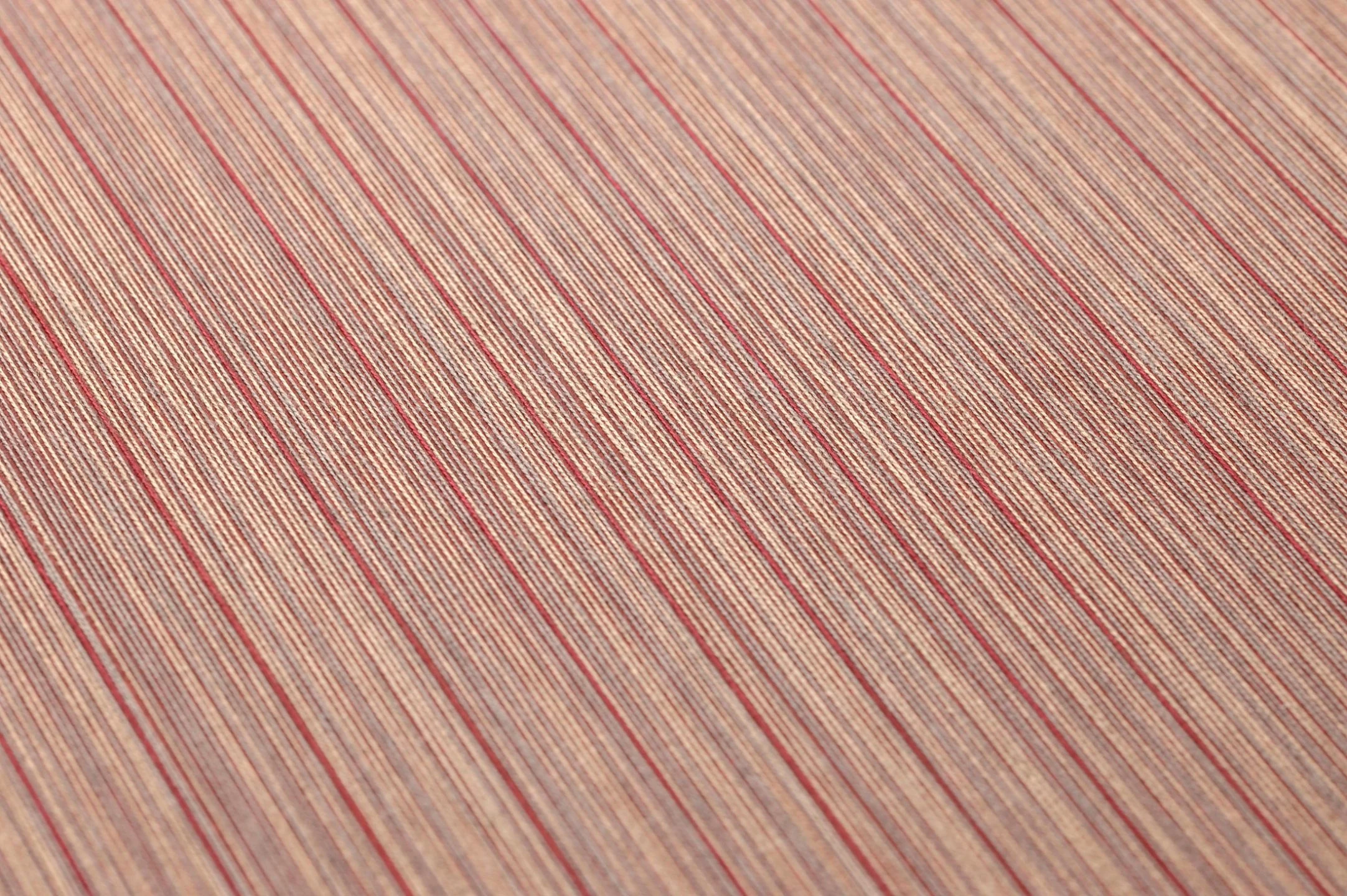 Die unterschiedlichsten Rot-, Grau- und Beigetöne, die sich auf dieser Textiltapete zu einem Wärme ausstrahlenden Gesamtbild vereinen, geben Ihrer Wand durch den parallelen Fadenlauf der verwendeten Kettfäden eine klare Struktur. Gleichzeitig sorgen die Farbnuancen für Lebendigkeit und den Eindruck von Individualität und Einzigartigkeit. Dunkle Holztöne und eine der Farbnuancen als weitere Wandfarbe runden das Raumbild zu einem stimmigen Gesamteindruck ab und verbreiten Gemütlichkeit.