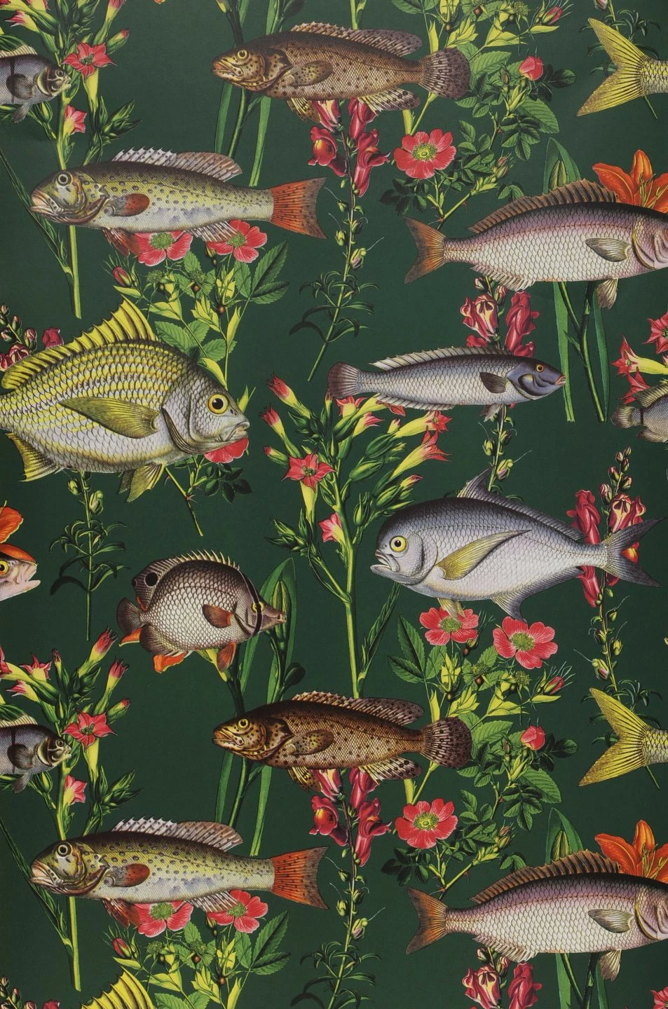 Auf dieser ausgefallenen Tiermotiv-Tapete treffen zwei Welten aufeinander: Bei genauerem Hinsehen entpuppen sich die Pflanzen, zwischen denen naturgetreu dargestellte Fische schwimmen, als blühende Sommerblumen aus der Welt über Wasser. Papiertapete Pantea mit ihrem dunkelgrünen Grund, den frischen Grüntönen der Blätter und den rot blühenden Blumen regt die Phantasie an und bietet Abwechslung vom Alltag.