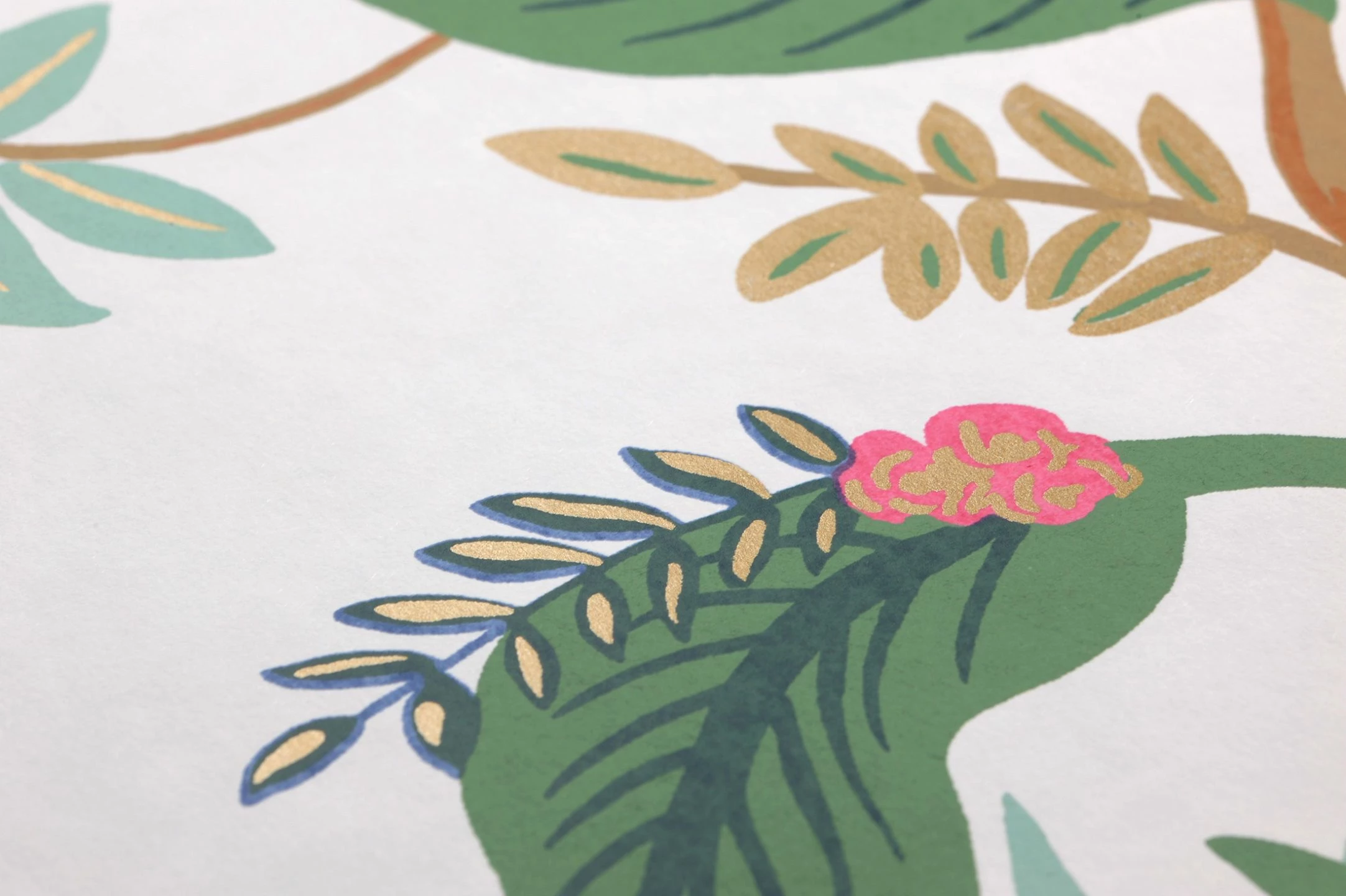 Ein tropisches Paradies mit üppigen Pflanzen in verschiedenen Grüntönen und bunten Blüten sorgt für Urlaubsstimmung. Dazwischen thronen prächtige Pfauen mit ihren beeindruckenden Schwanzfedern. Die farbenfrohe Vliestapete fasziniert mit liebevoll gemalten Details und goldfarbenen Lichtreflexen und passt zu einer Vielzahl von Einrichtungsfarben und Stilen. In jedem Fall zaubert sie gute Laune an die Wände!