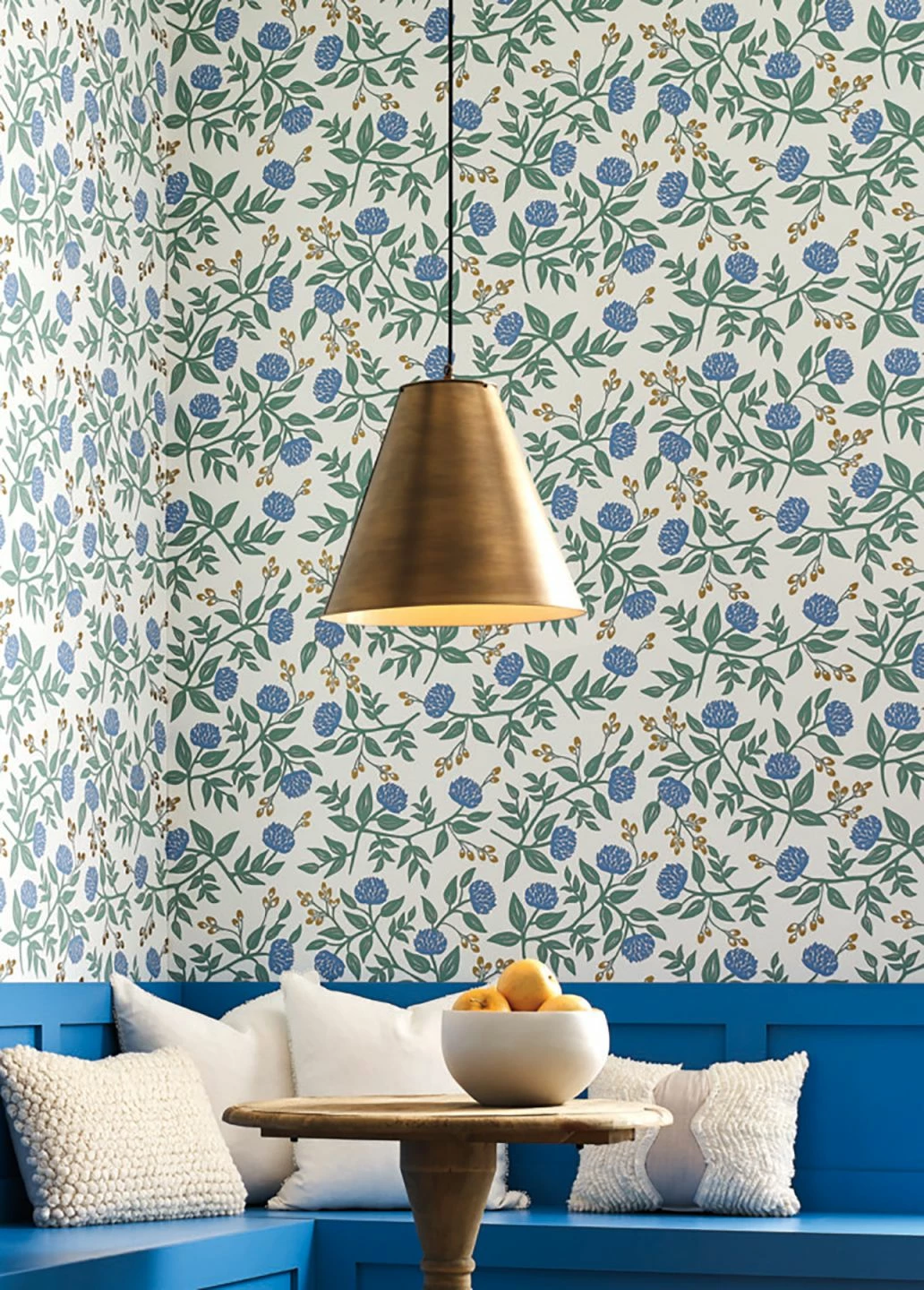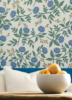 Zwischen dem fein abgestimmten Blau der Blüten und dem Grün der Blätter und Zweige bilden die goldfarbenen Knospen zart schimmernde Highlights. Zusammen mit dem weißen Hintergrund lassen sie Ihren Raum leicht und hell wirken. Die mit wenigen Pinselstrichen angedeuteten Blumen erinnern an Elemente aus der Bauernmalerei, sind in ihrer lebendigen Anordnung jedoch absolut zeitlos.