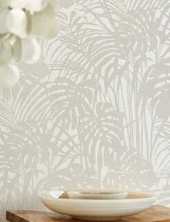 Grauweiss und Silbergrau Glitzer bilden die Farbwelt ab, in der Luxus Tapete Persephone dem exotischen Glamour die funkelnde Krone aufsetzt. Die Palmzweige sind mit unzähligen Glasperlen besetzt, die glanzvoll im Licht schimmern.