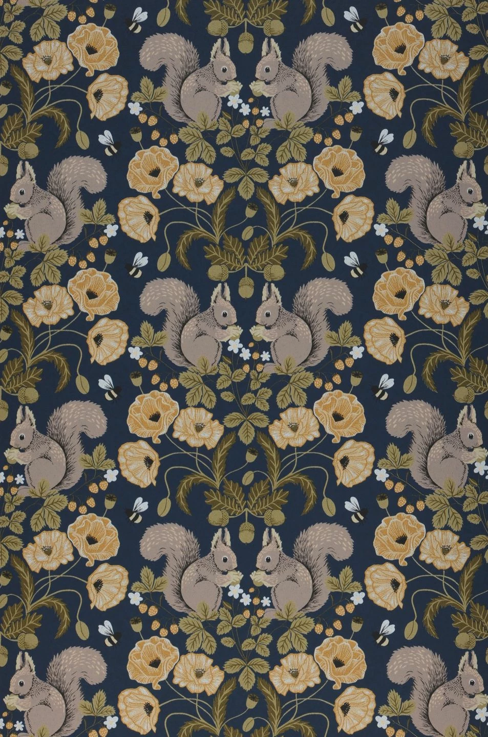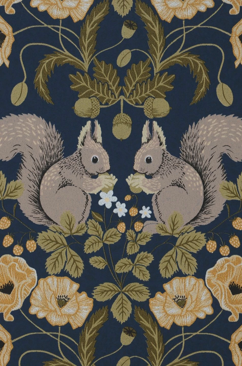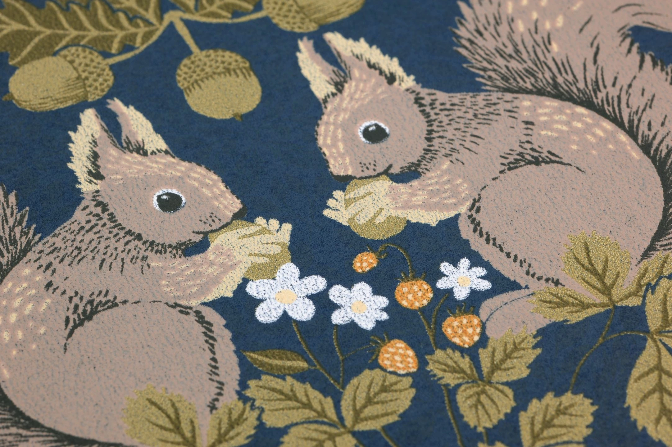 Hier sind die niedlichen Eichhörnchen der Hingucker. Immer zu zweit angeordnet, setzen sie sich zusammen mit den Blüten, Blättern und Früchten, die sie umgeben, zu einem symmetrischen, klassisch anmutenden Arrangement zusammen. So vereint Pihla Vintage-Elemente in Farbgebung und Form mit ausgefallenen Motiven, die zum freundlichen skandinavischen Stil ebenso harmonieren wie zu antiken Möbeln. Der dunkelblaue Hintergrund steuert Ruhe und Hochwertigkeit bei.