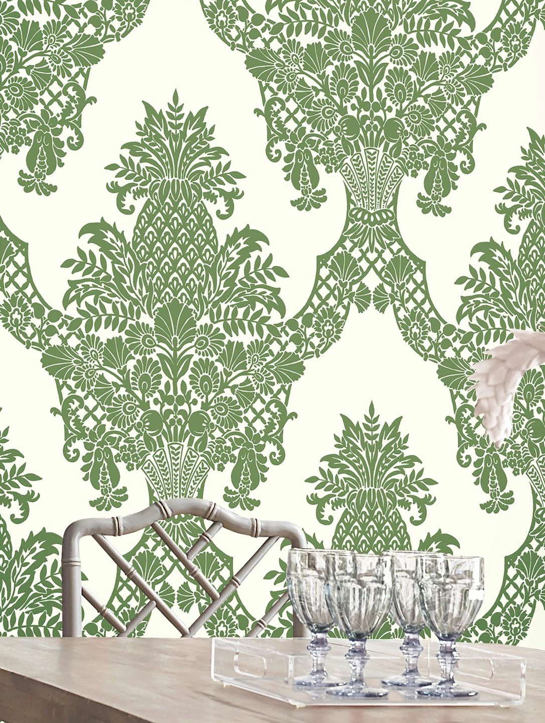 Im Mittelpunkt stehen Ananasfrüchte, mit Blumen und Blättern zu einem klassischen Barockmuster arrangiert. Das gedeckte Laubgrün des Musters kontrastiert angenehm mit der weißen Grundfarbe und hebt die filigranen, stilisierten Blütenarrangements kunstvoll hervor. Aufwändig und in der Konzentration auf zwei Farben unaufdringlich, schmückt die hochwertige Papiertapete Ihr gestyltes Esszimmer oder Ihr Wohnzimmer mit antiken oder auch modernen Möbeln.