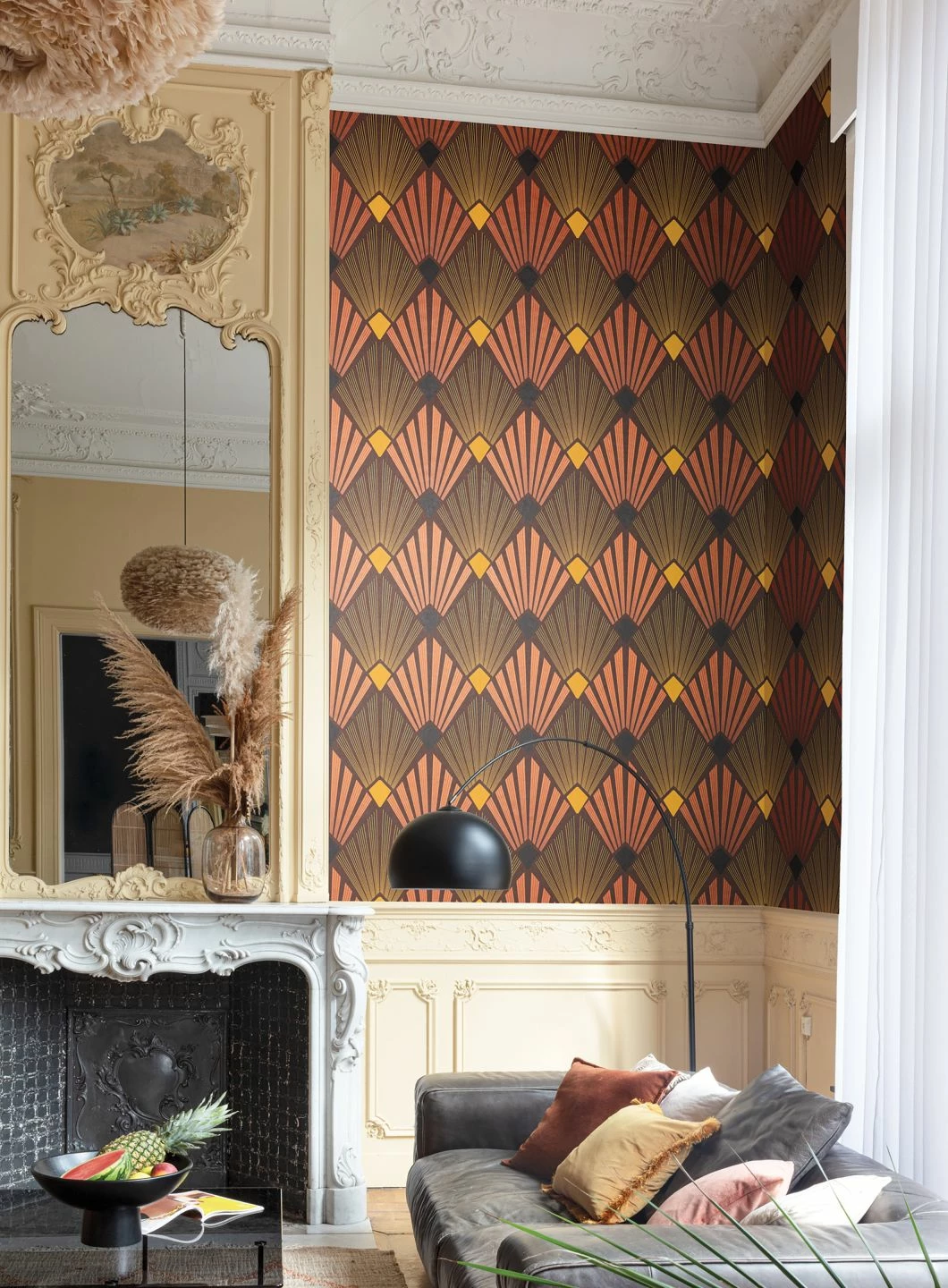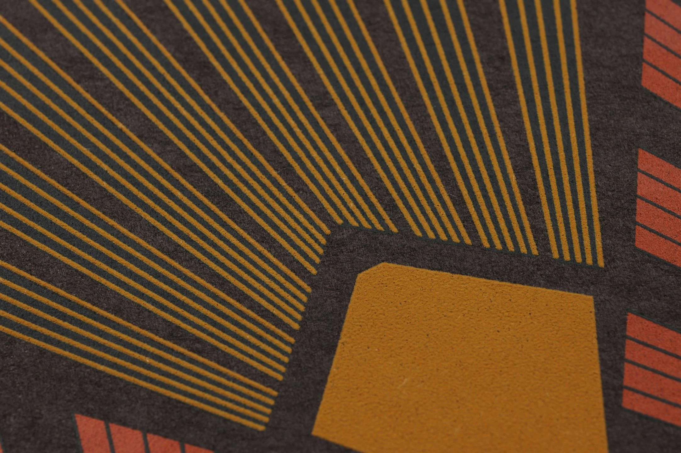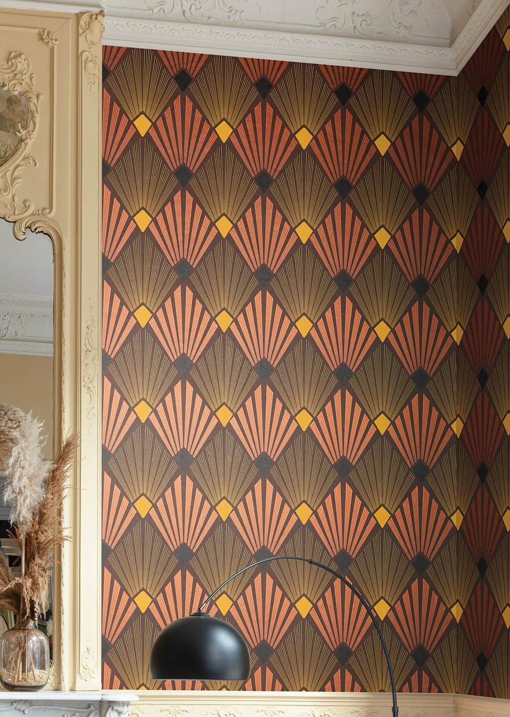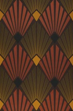 Intensive, warme Erdfarben betonen das markante Art-Deco-Design von Vliestapete Pontinius. Der Kontrast zwischen dem kräftigen Perlkupfer, dem dunklen Schwarz und Sepiabraun und dem prägnanten Ginstergelb unterstützt den dynamischen, beinahe plastischen Eindruck des Musters aus aufgefächerten Strahlen. Charaktervolle Retro-Möbel in einer der Musterfarben gehen eine reizvolle Verbindung mit der Tapete ein und nehmen Sie mit auf eine Zeitreise.