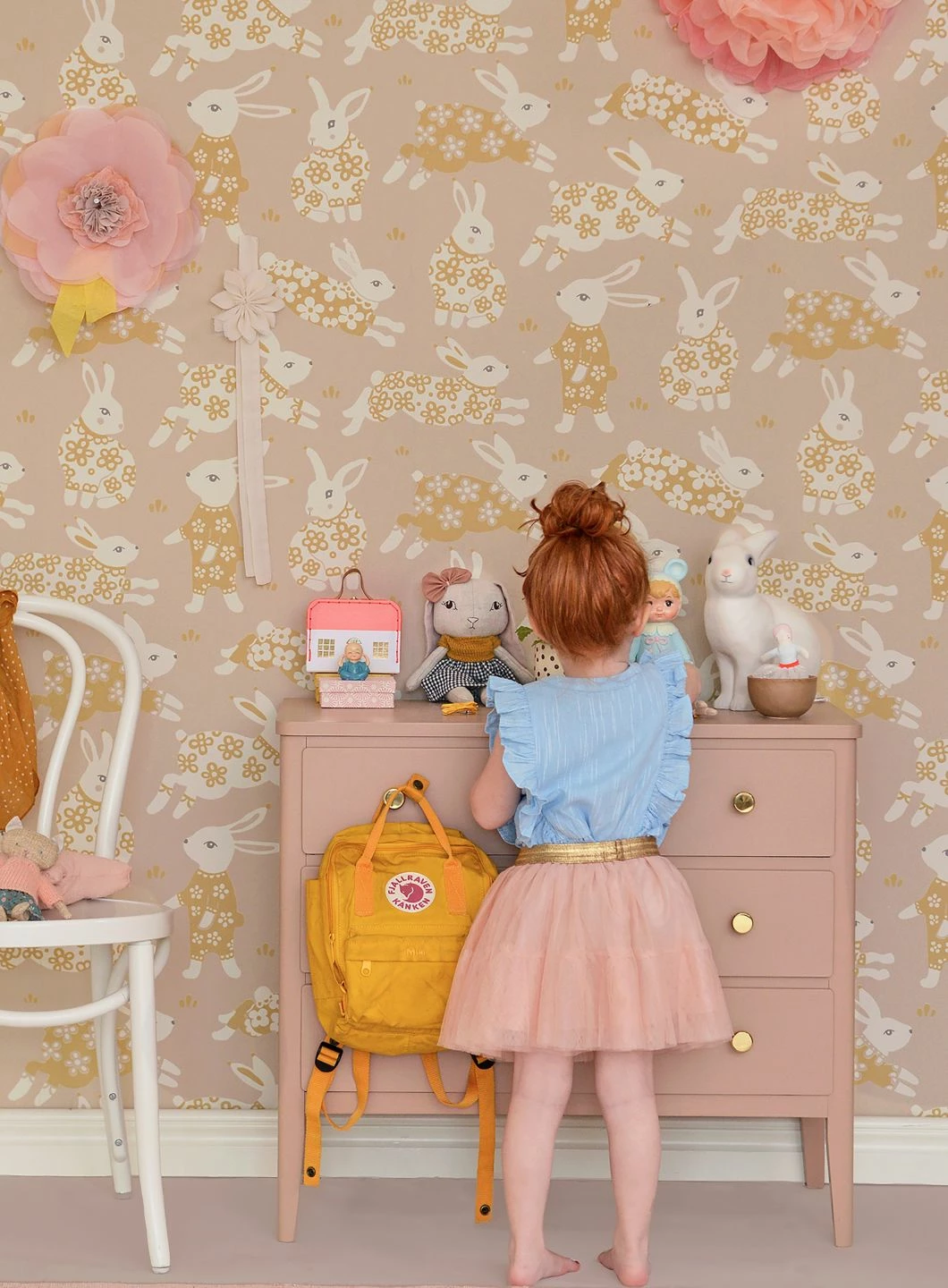 Kaninchen mit ihren großen Augen und den langen Ohren hüpfen, laufen und sitzen auf dieser Kinderzimmertapete der schwedischen Designerfirma Majvillan umher. Die hübschen im Leimdruckverfahren auf die Tapete gedruckten Tiere wirken mit ihren geblümten Körpern wie die Illustrationen eines phantasievollen Kinderbuchs. So regen sie zum kreativen Spielen an und fördern die kindliche Vorstellungskraft.