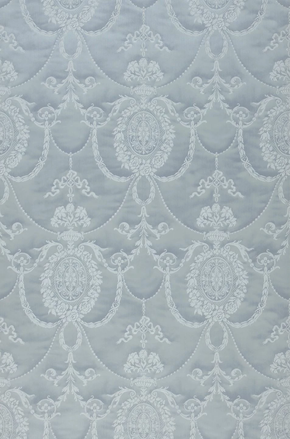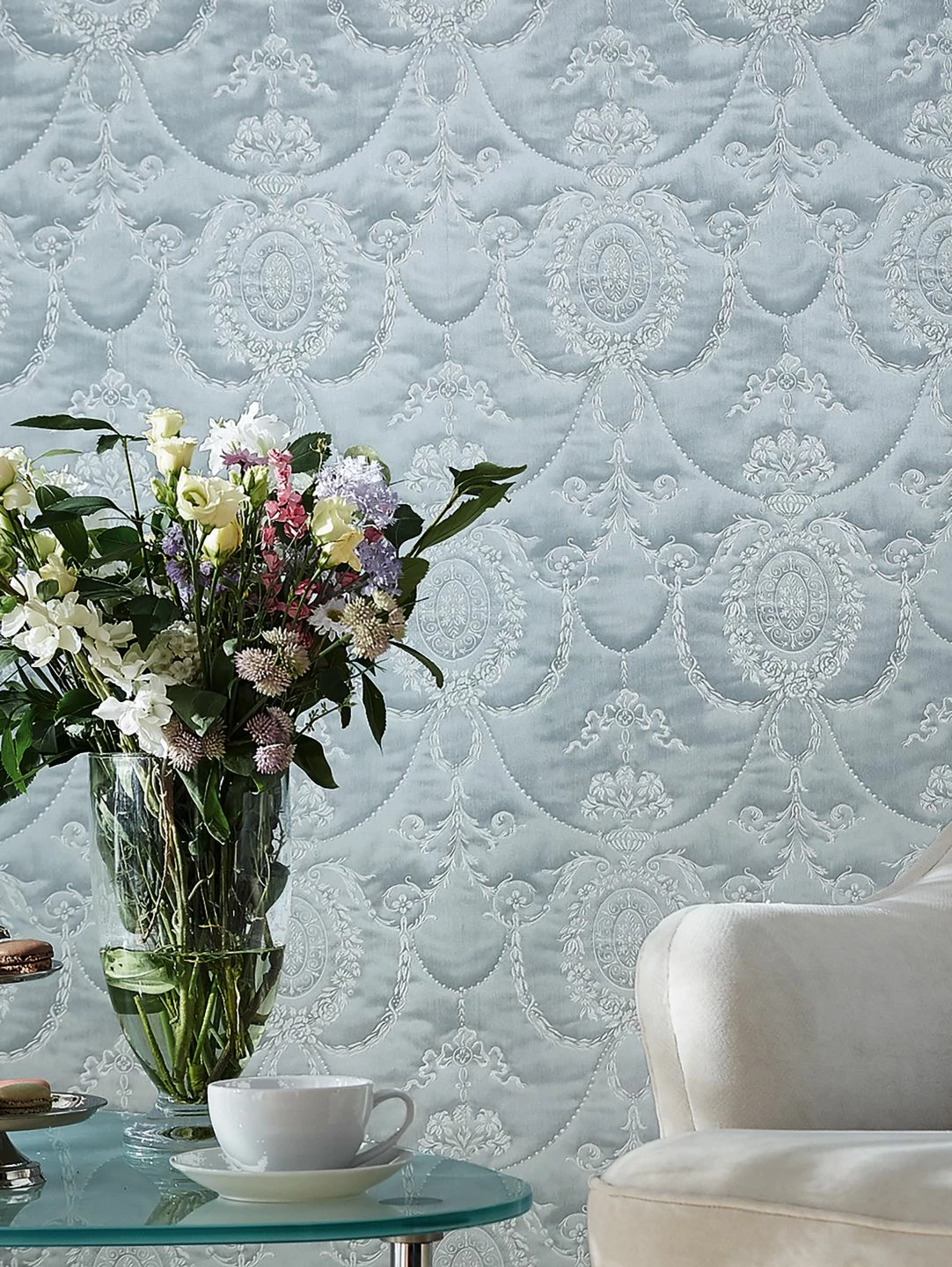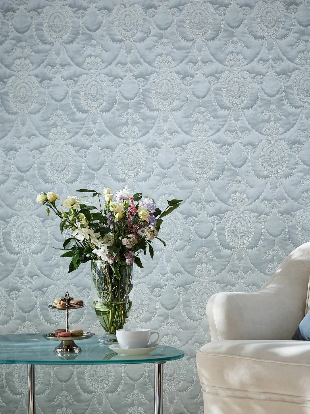 Kühle, zeitlose Eleganz verströmt das helle, leicht schimmernde Grau der beeindruckenden Barocktapete Rabia. In das Vinyl der Oberfläche ist ein ausladendes klassisches Tapetenmuster aus feinen stilisierten Blüten und Blattranken eingearbeitet. Wie bei einem kostbaren handbestickten Stoff kann man die Ziernähte fühlen, zwischen denen sich der Stoff hervorzuwölben scheint. Rabia betont die Größe Ihres Raums und schafft eine edle Atmosphäre.