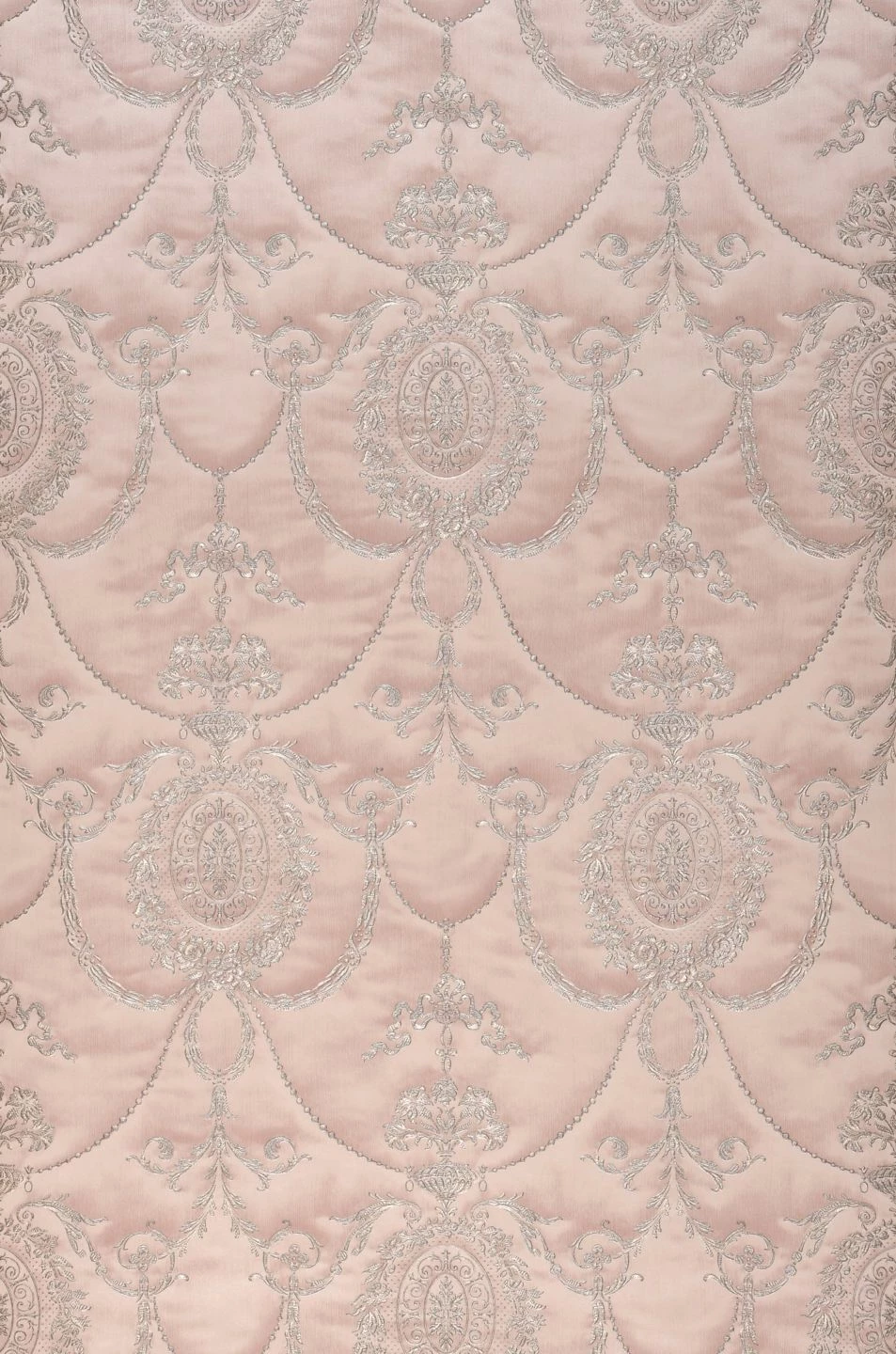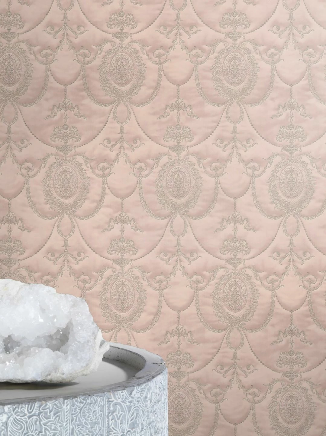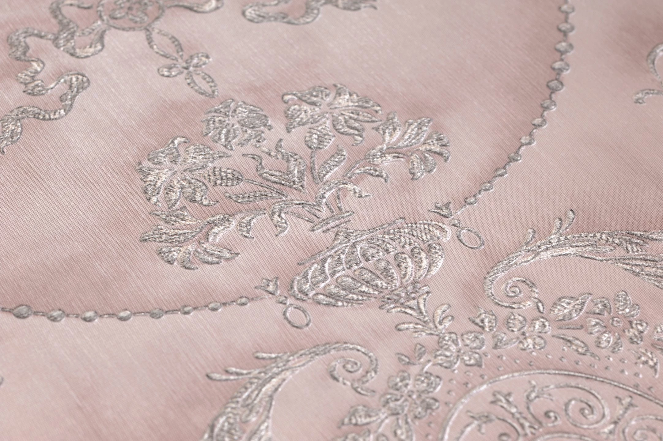 Wie das Gemach einer Prinzessin wirkt ein Raum, den die zartrosafarbene Vliestapete Rabia schmückt. Wie handgestickt in einen kostbaren Wandbehang sind barocke Ornamente in das Vinyl ihrer Oberfläche eingeprägt. Die fühlbare, an eine Textiloberfläche erinnernde Struktur macht die Tapete zu einem überzeugenden Stück Luxus für ein romantisches Schlafzimmer, ein edles Wohnzimmer oder ein verspieltes Mädchenzimmer.