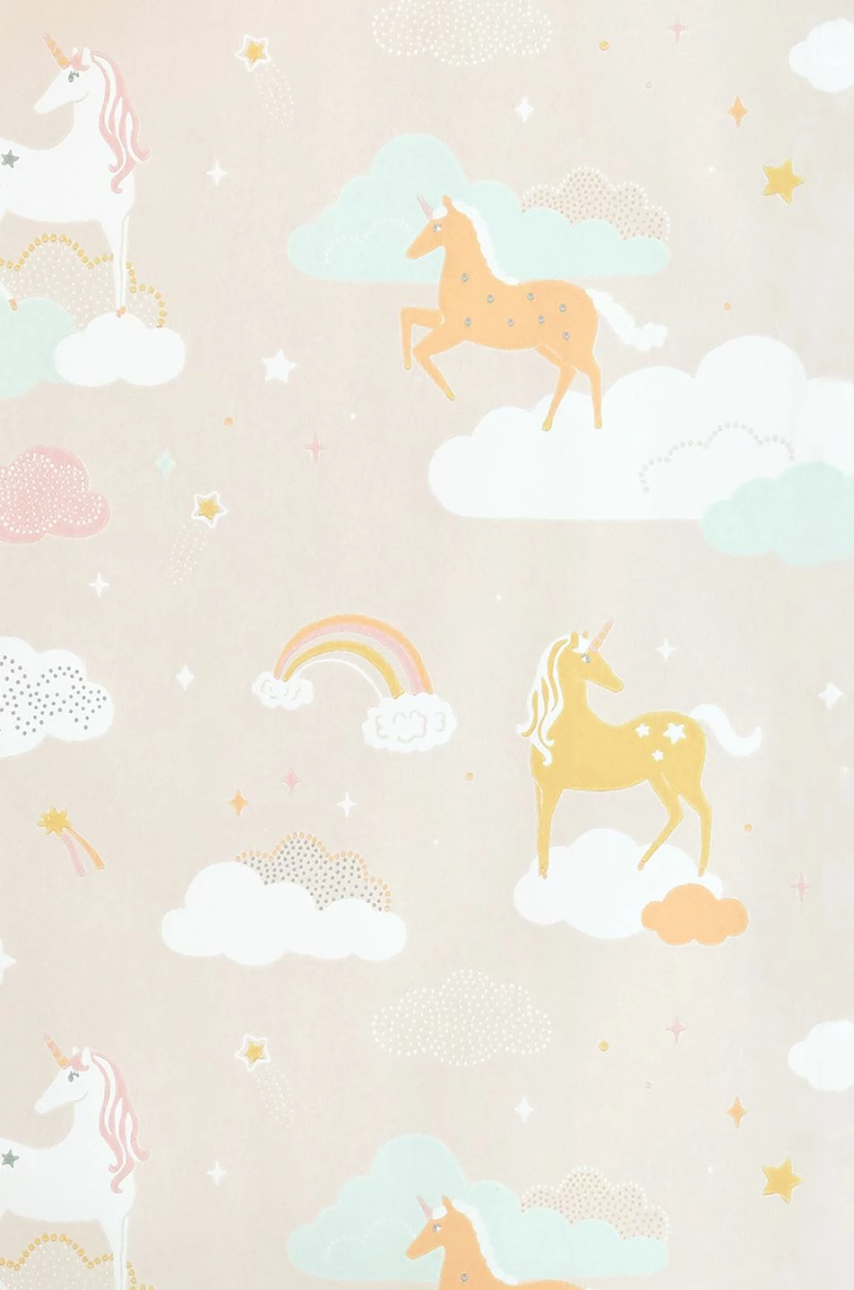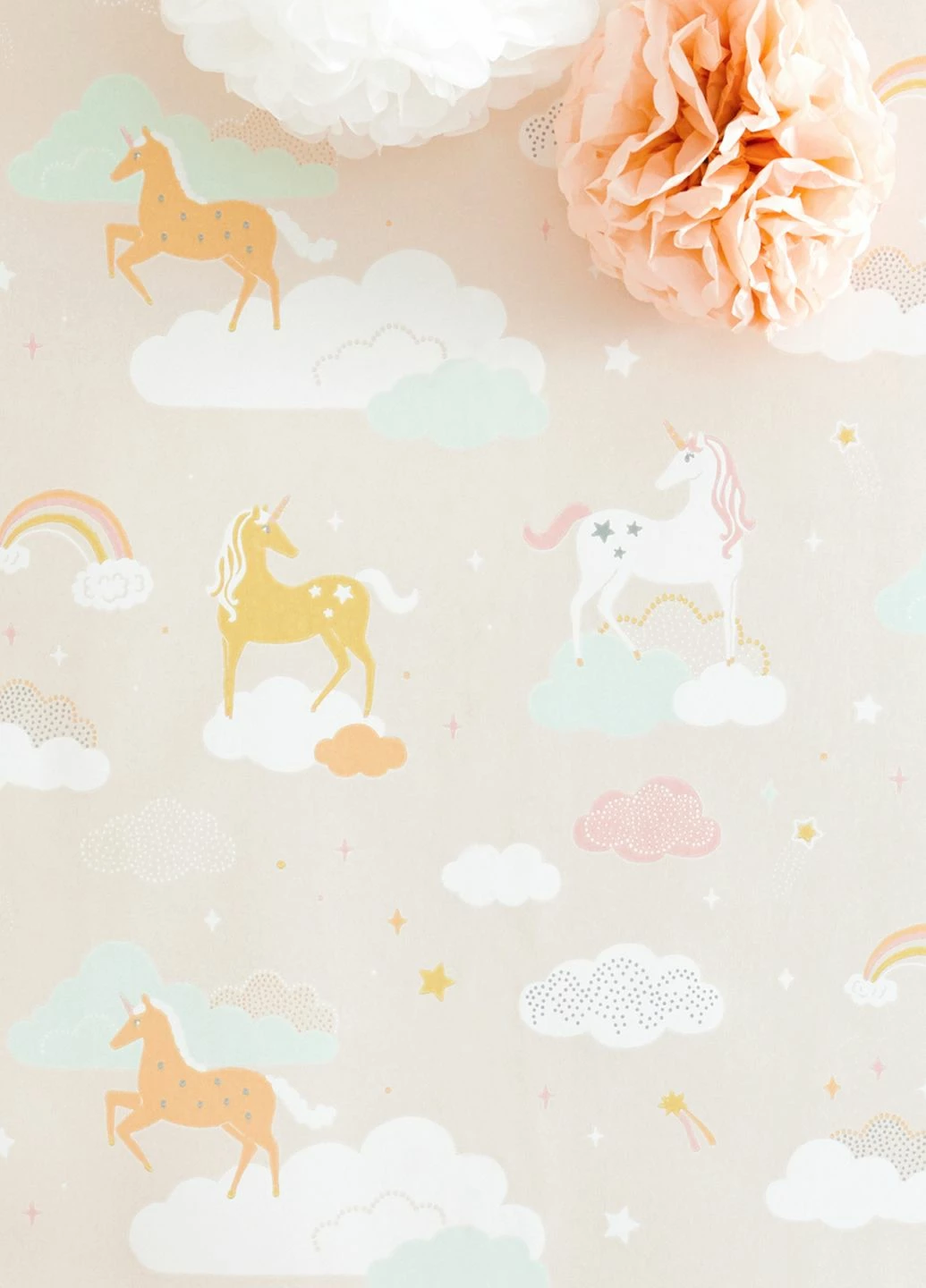Bunte Einhörner auf Wolken, dazwischen Sterne und Regenbögen – die Vliestapete „Rainbow treasures“ vom schwedischen Hersteller Majvillan beschwört ein kindliches Abenteuerland herauf. Die Motive in Altrosa, Cremeweiß, Honiggelb, Pastellorange und Weißgrün und der zartrosa Hintergrund wirken freundlich und anregend. Die hochwertige, im Leimdruckverfahren bedruckte Tapete begleitet Ihr Kind behutsam auf seiner Entdeckungsreise in die Welt.