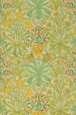 Voller leuchtender Gelb- und Grüntöne auf dem zart gemusterten Grund bringt Rebecca frühlingshaftes Sonnenlicht an Ihre Wände. Das historische Muster von Morris & Co., das dem britischen Designer John Henry Dearle zugeschrieben wird, vereint die stilisierten Blüten und Blattranken des Jugendstils mit den frisch leuchtenden Farben des Frühlings. Im Mittelpunkt stehen kräftig gelbe Tulpen, deren Blätter sich wie ein Feuerwerk vom Stängel her ausbreiten.