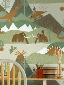 Hier leben verschiedene Dinosaurier, Urmenschen, Mammuts und Flugsaurier friedlich Seite an Seite – in einer Welt voller Berge, Bäume und Vulkane. Jedes Kind, das Dinosaurier liebt, wird sich über diese faszinierende Papiertapete in seinem Kinderzimmer freuen. Die Ästhetik der Urzeitwelt erinnert an Collagen und ist kindgerecht, phantasieanregend und freundlich mit einem großen Augenzwinkern gestaltet.
