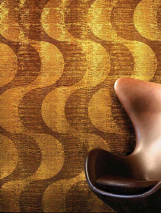 Exklusive Lederoptik für die Wände – luxuriös golden schimmernd und in welligen Formen arrangiert. Die handbedruckte Vliestapete von Flavor Paper spielt mit dem Look von echtem Krokodilleder und kreiert eine vornehm-elegante und dabei unaufdringliche Ästhetik für Flur oder Lobby, Schlaf- oder Wohnräume. Sie erhalten die Tapete ab einer Mindestabnahmemenge von drei Rollen.