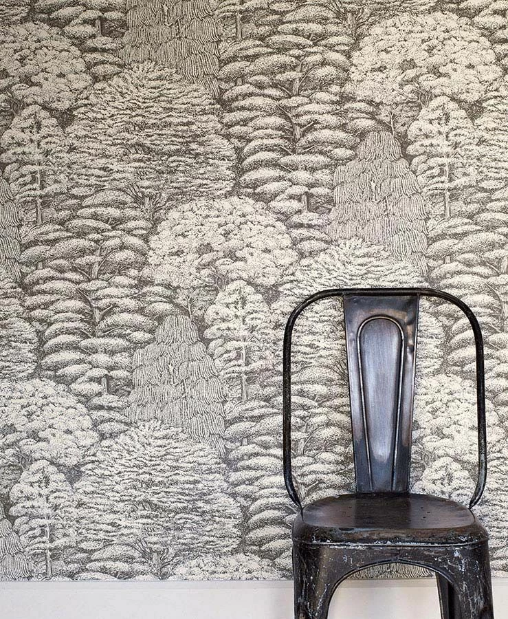 Ein dichter Wald voller hoher, alter Bäume – wie ein Kupferstich ist die Vliestapete „Roderik“ in nur zwei Farben gehalten. Braungraue sanfte Striche, Tupfer und Schraffuren auf cremeweißem Grund reichen aus, um eine ganze Waldlandschaft mit verschieden geformten Baumkronen, der Struktur der Rinde und die Illusion von tiefer Undurchdringlichkeit zu erschaffen. Möbel aus dunklem Holz bilden eine schöne Ergänzung zu dieser botanischen Tapete.