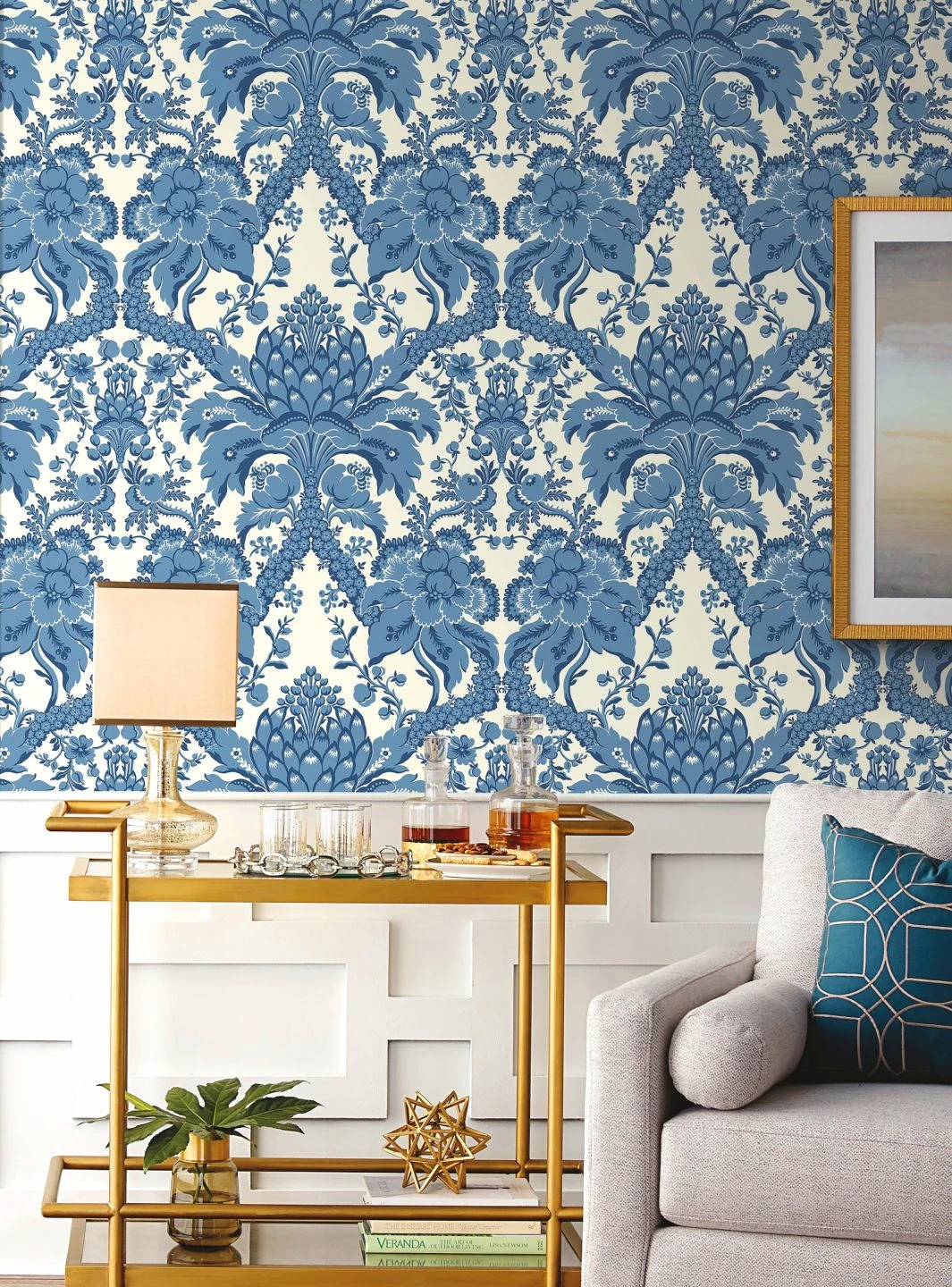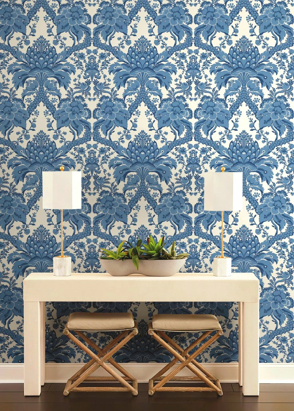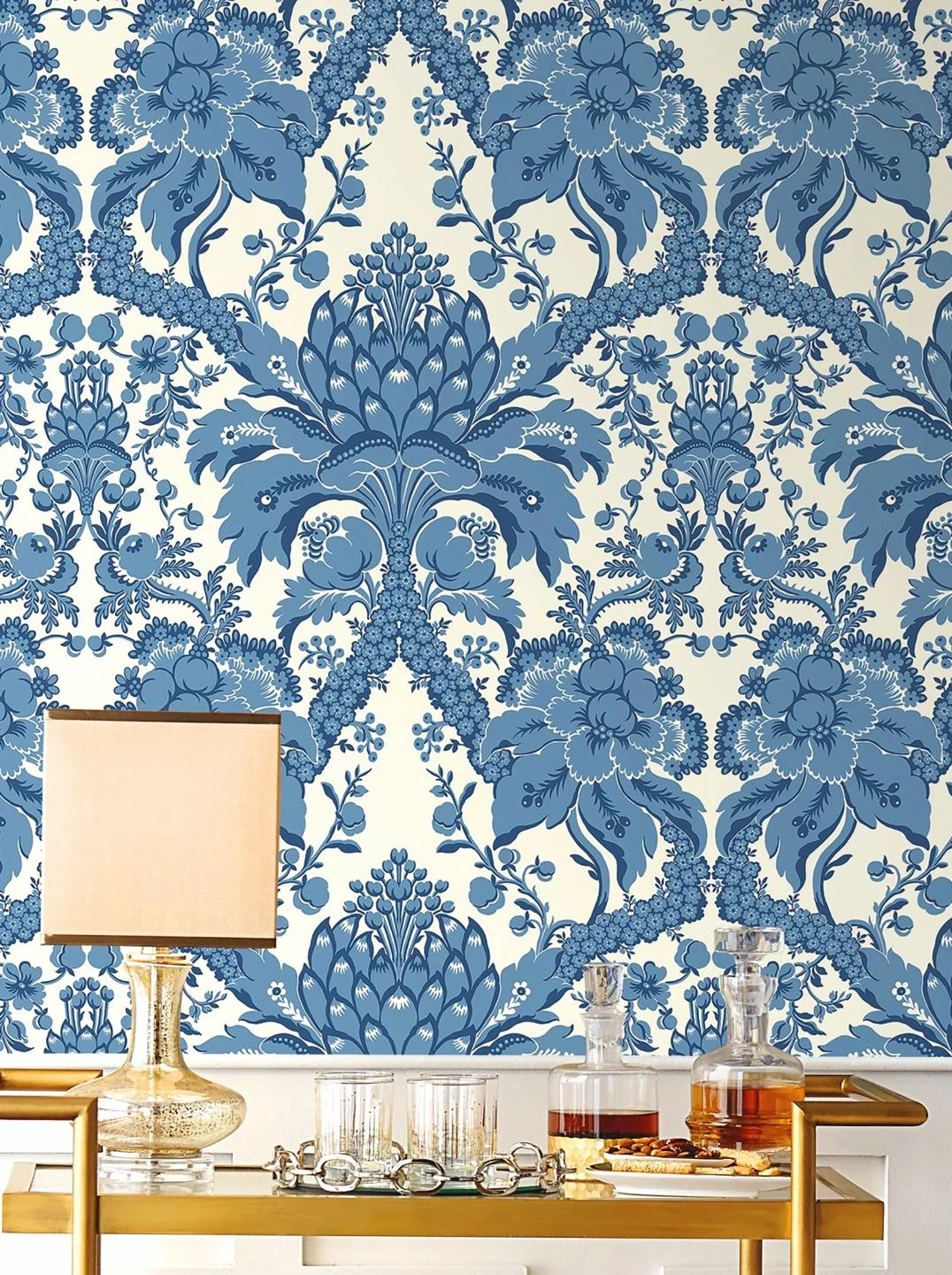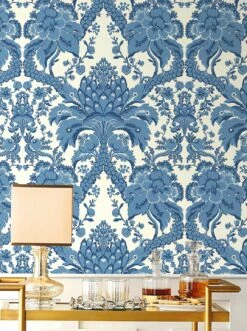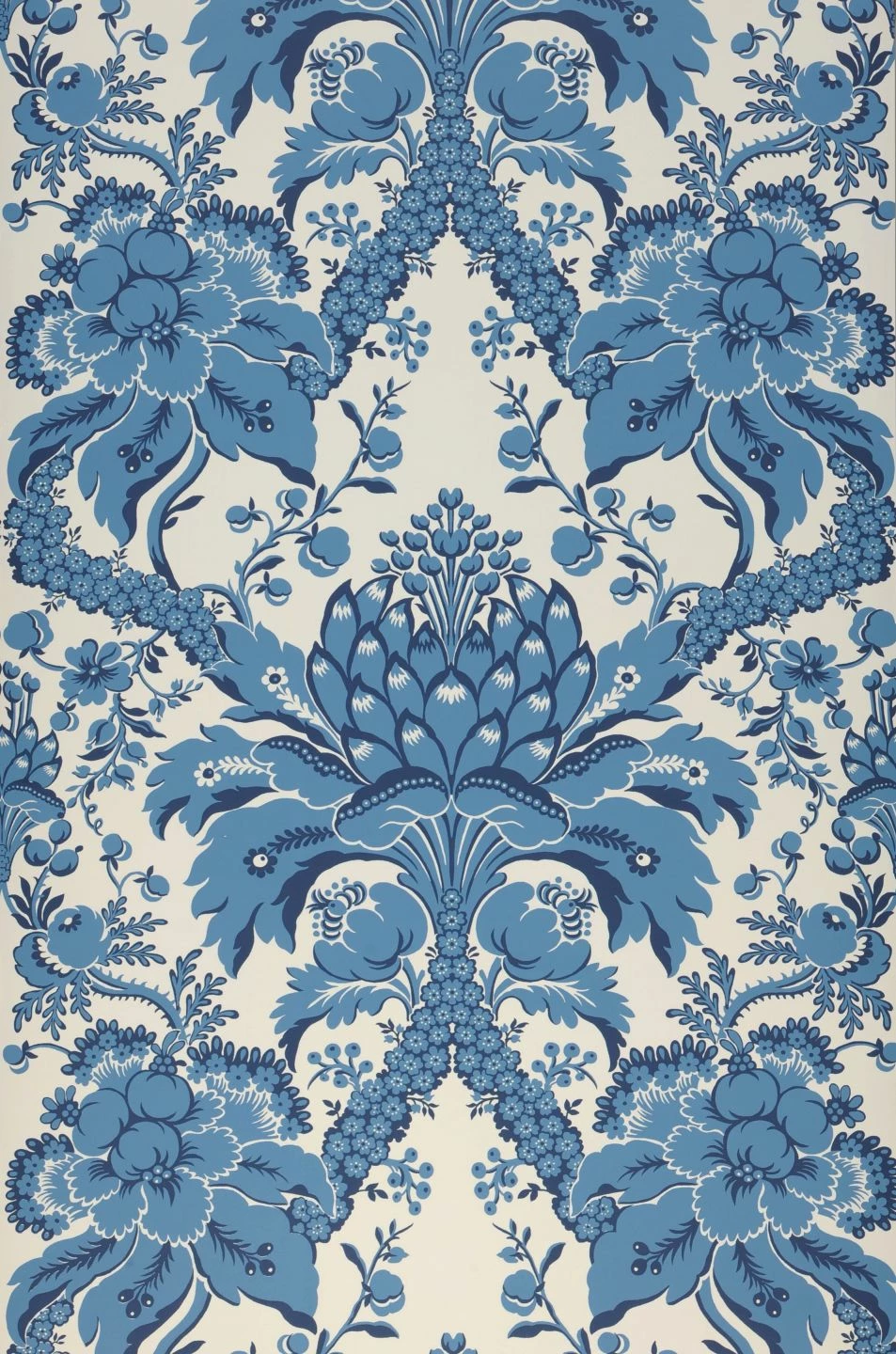 Ein von der Tradition der Barocktapete inspiriertes Muster entsteht aus den bizarren Formen der Artischocke. Die charakteristischen Blütenblätter bilden das Zentrum und den Ausgangspunkt für wunderbar geschwungene Bögen und Ranken aus großen und kleinen Blüten, Blättern und Blattranken. Die Blautöne auf dem weißen Grund lassen die Papiertapete gleichzeitig frisch und leicht wirken und geben ihr ein zeitgemäßes Flair.