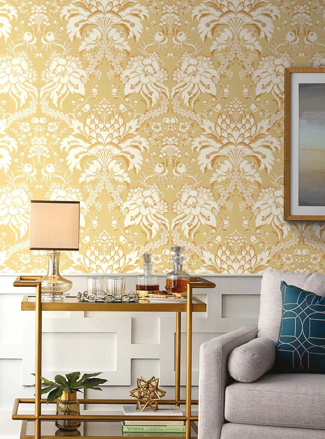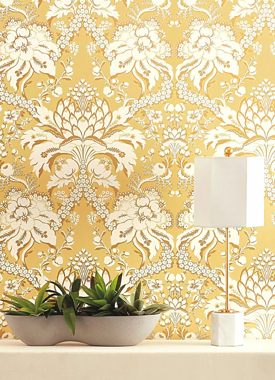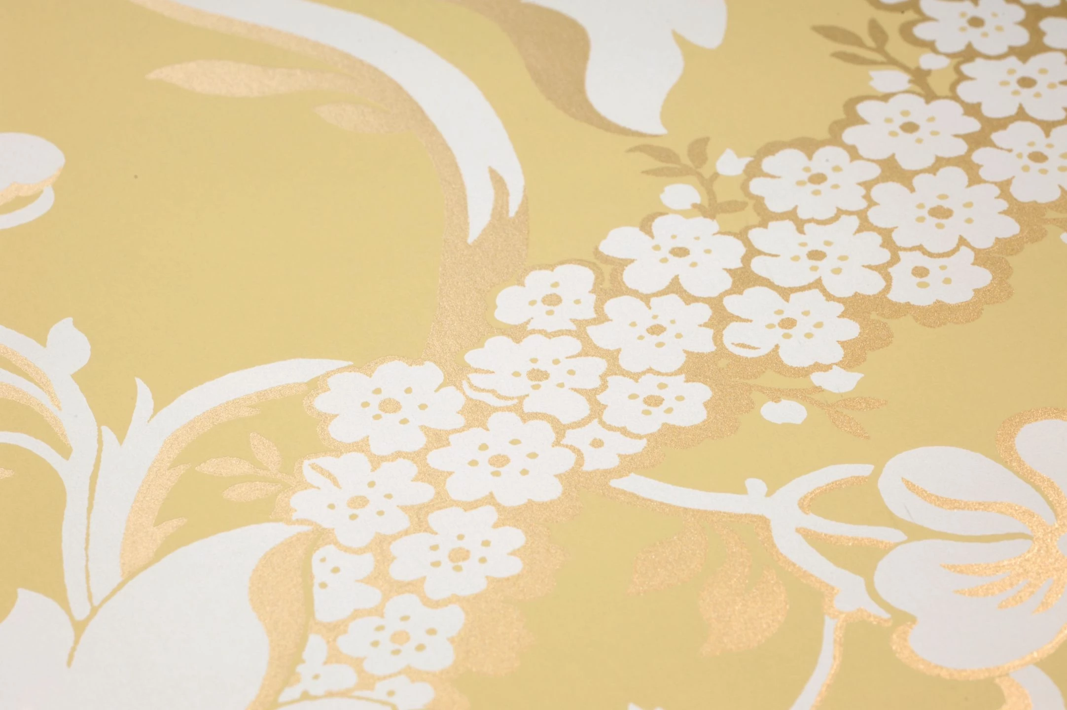 Besonders edel wirkt das barocke Tapetenmuster, das sich aus den Blütenständen der Artischocke entwickelt, durch die weißen und perlgoldfarbenen Elemente auf dem elfenbeinfarbenen Grund. Zwischen den Arrangements aus Artischocken und stilisierten Blättern schaffen Girlanden aus kleinen Blüten sowie locker dahingestreute Blumen eine Verbindung. Eine Tapete, wie geschaffen für ein klassisches Wohnzimmer mit hellen Möbeln oder mit dunklem Holz.