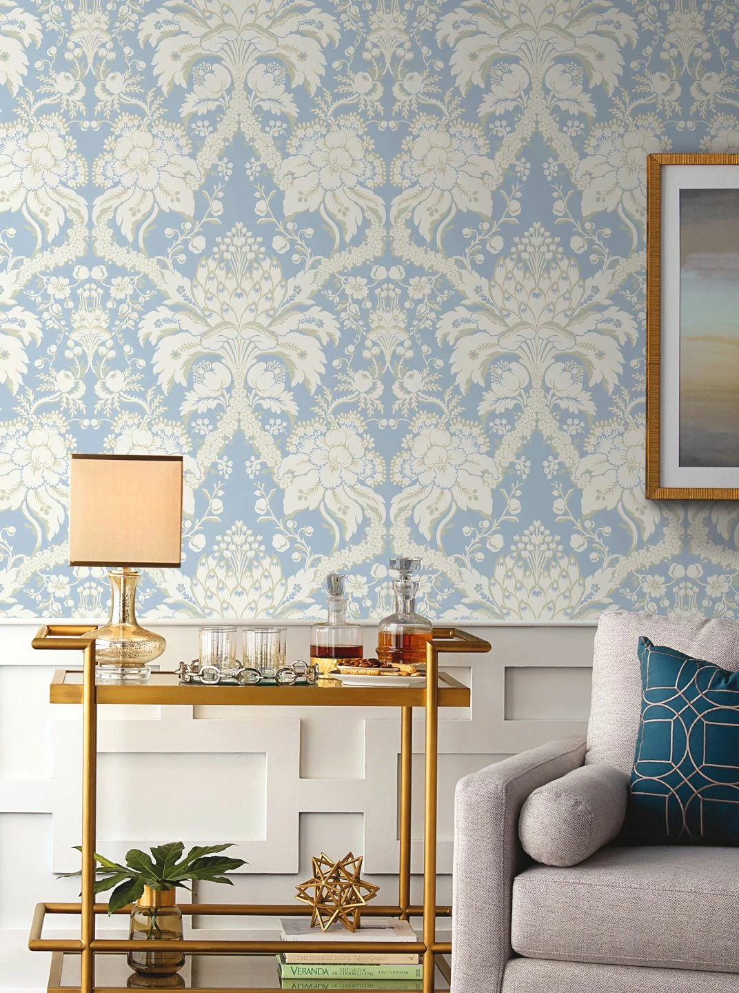 Dass die Artischocke nicht nur eine Delikatesse, sondern auch ein stilvolles Design-Element ist, erweist sich mit Papiertapete Royal Artichoke. Der Blütenstand der Artischocke steht im Zentrum des barocken Musters, das die einzelnen Blüten mit Ranken und Girlanden aus Blumen und Blättern zu einer faszinierenden Symmetrie verbindet. Mit den Ornamenten in Weiß und Kieselgrau auf hellblauem Grund verliert das Muster jede barocke Wuchtigkeit und erscheint schwerelos.