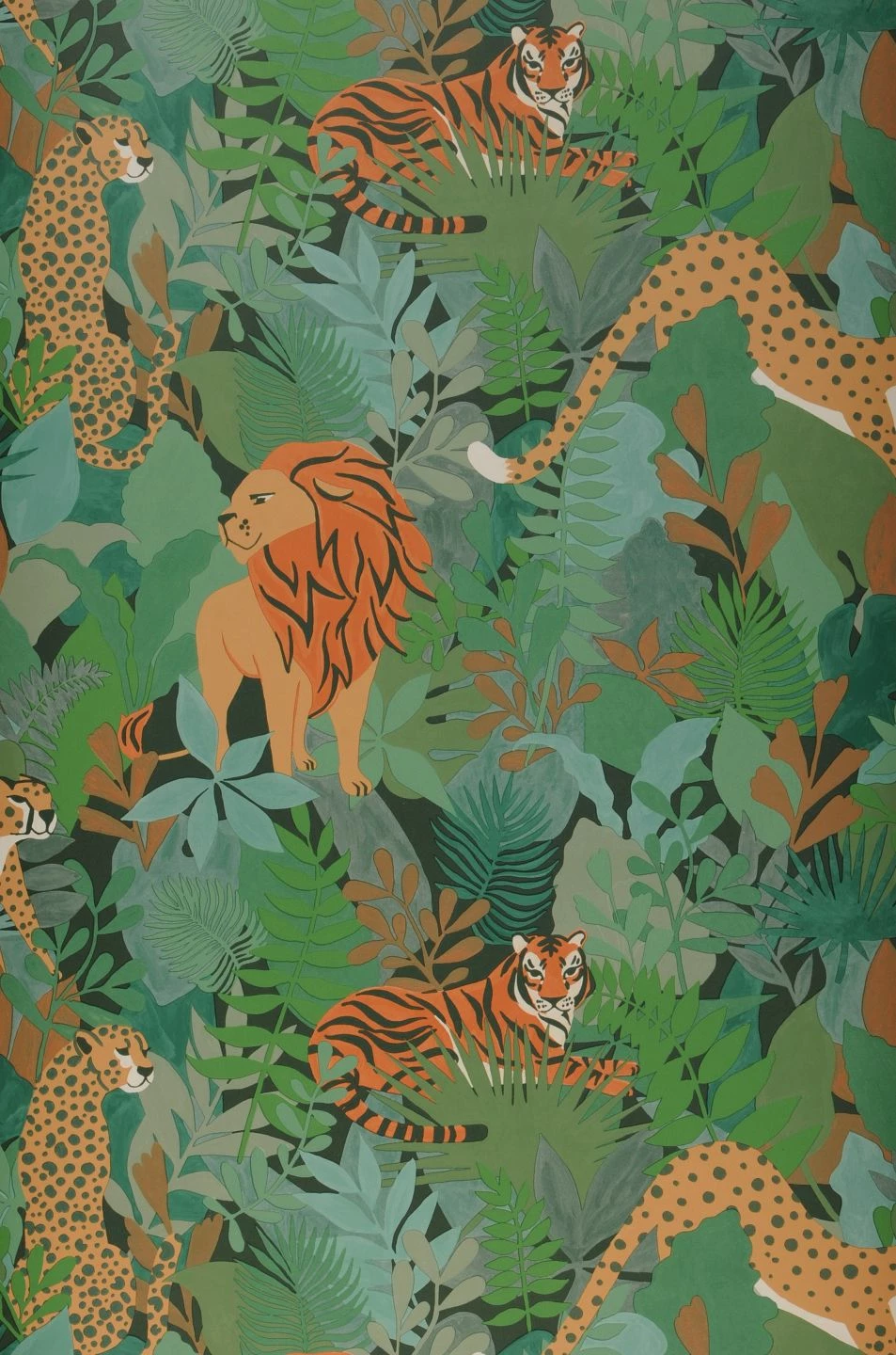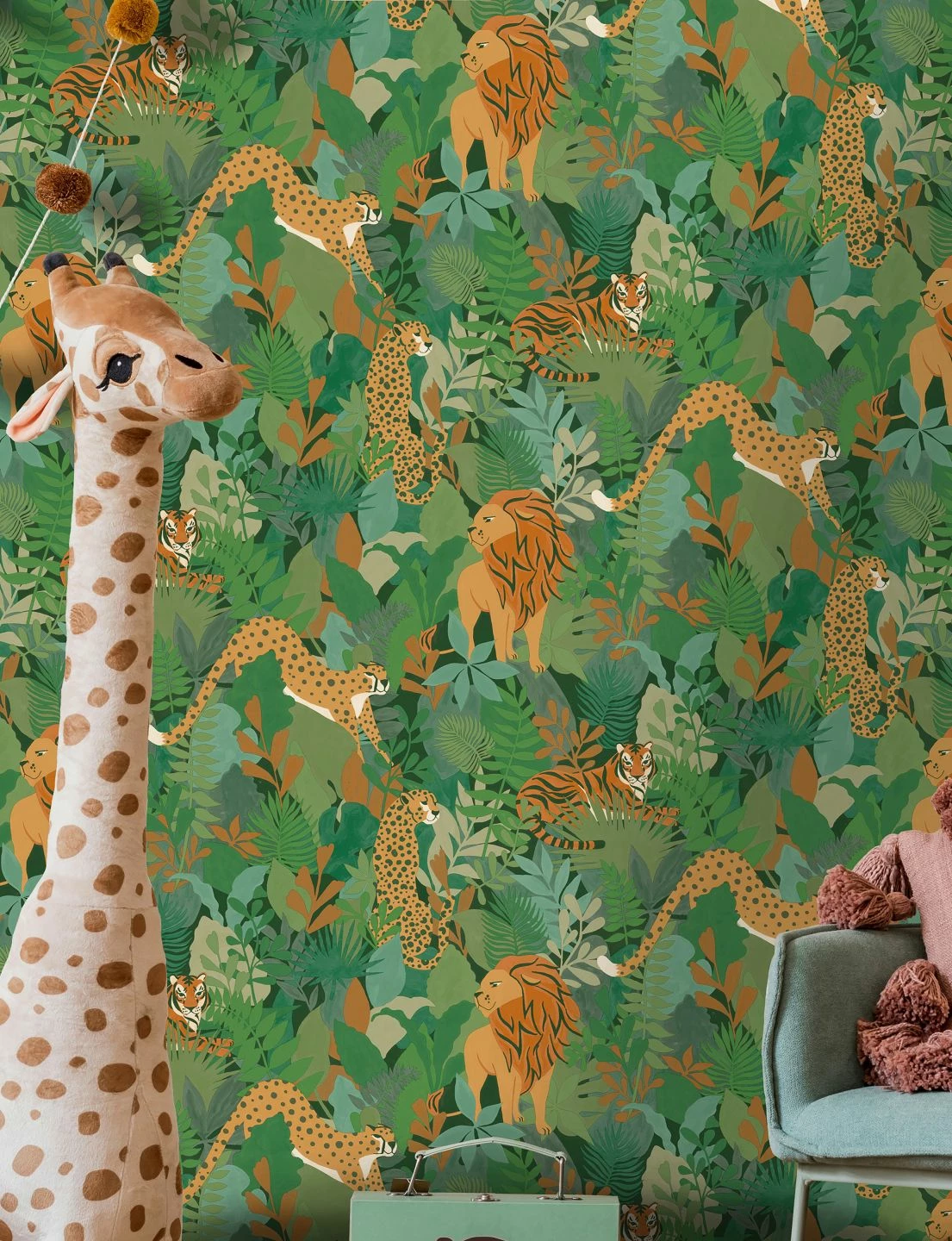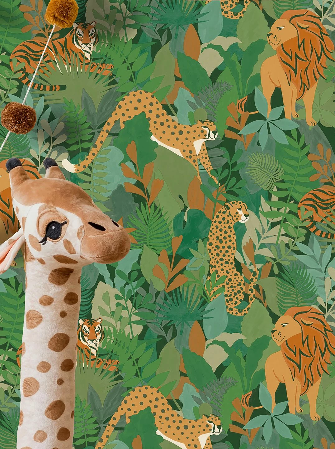 Wie Tarzan im tiefen Dschungel werden die kleinen oder größeren Bewohner des Zimmers von Löwen, Tigern und Leoparden beschützt. Ihre Stärke und Eleganz ist auf der liebevoll gestalteten Papiertapete wunderbar eingefangen. Die Grüntöne der exotischen Pflanzen und die verschiedenen Schattierungen von Ocker im Fell der Großkatzen ergeben eine natürlich anmutende Kulisse voller Leben, die Kinder und Jugendliche begeistern wird.