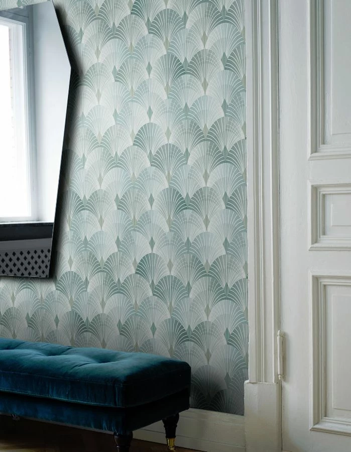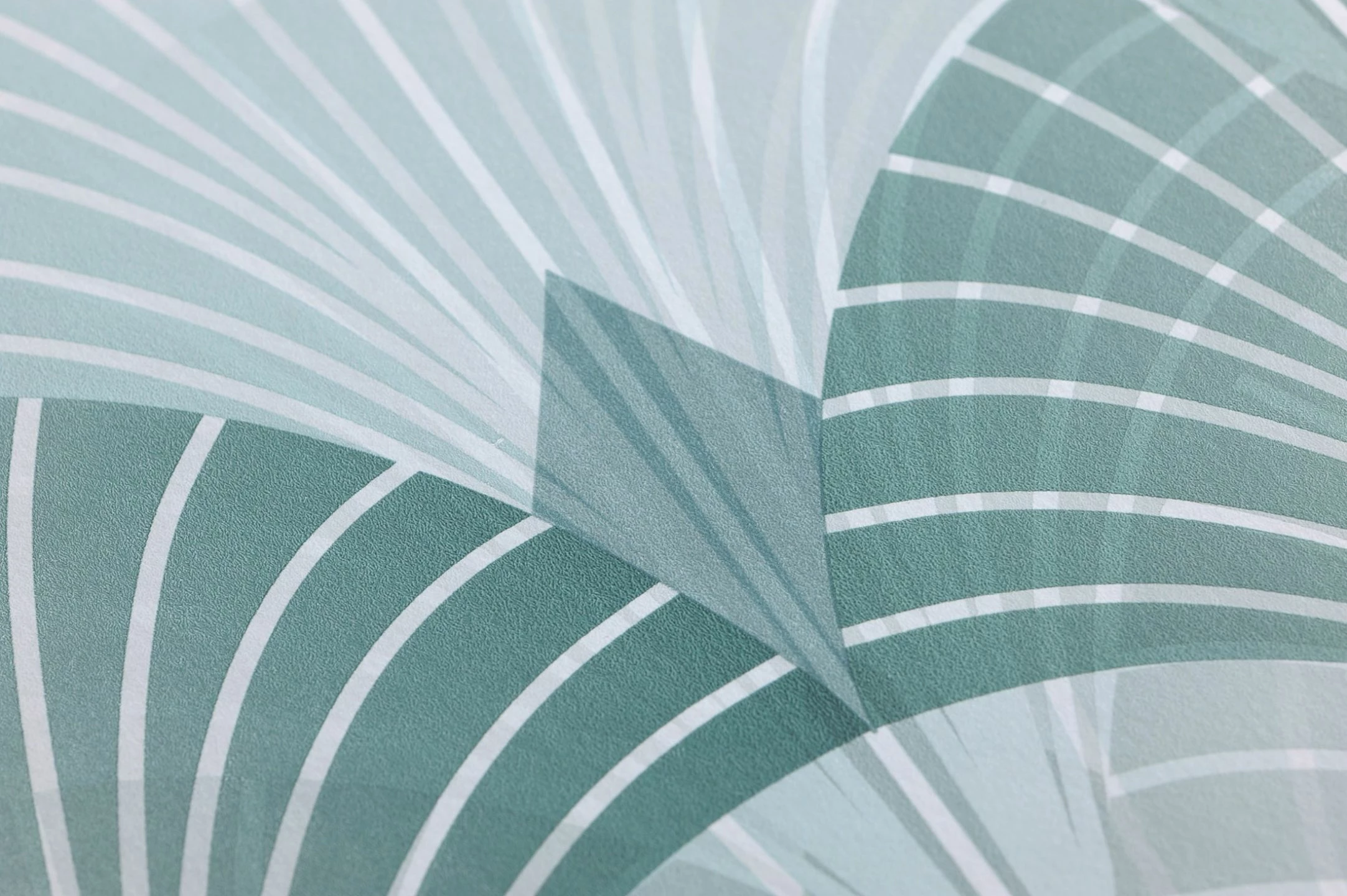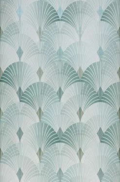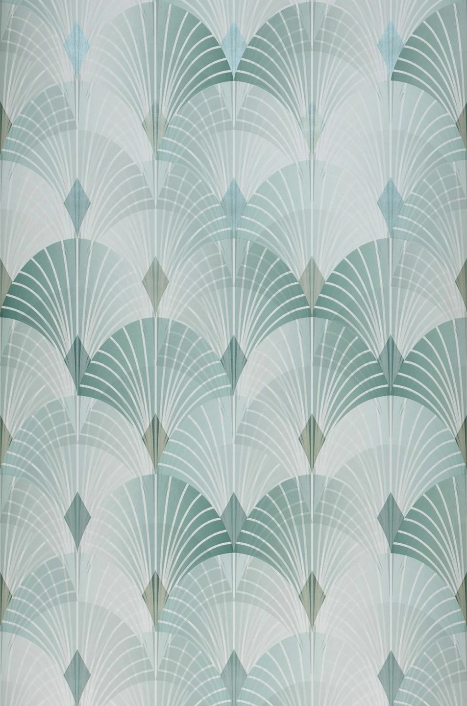 Diese Art Deco Tapete in einer himmlischen Farbkomposition aus Grünweiss, Minttürkis, Minttürkis Schimmer, Schilfgrün Schimmer trägt Sie auf Wolken. Das feine Spiel aus hellen und dunklen Fächerelementen bildet eine füllige optische Struktur, in der sich die Sinne fallen lassen können. Famose Leichtigkeit geht mit fein schimmernden Glamour einher.