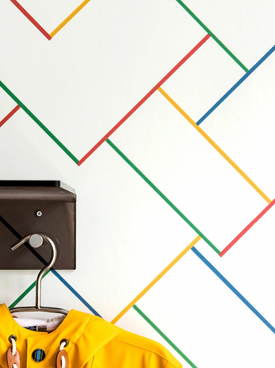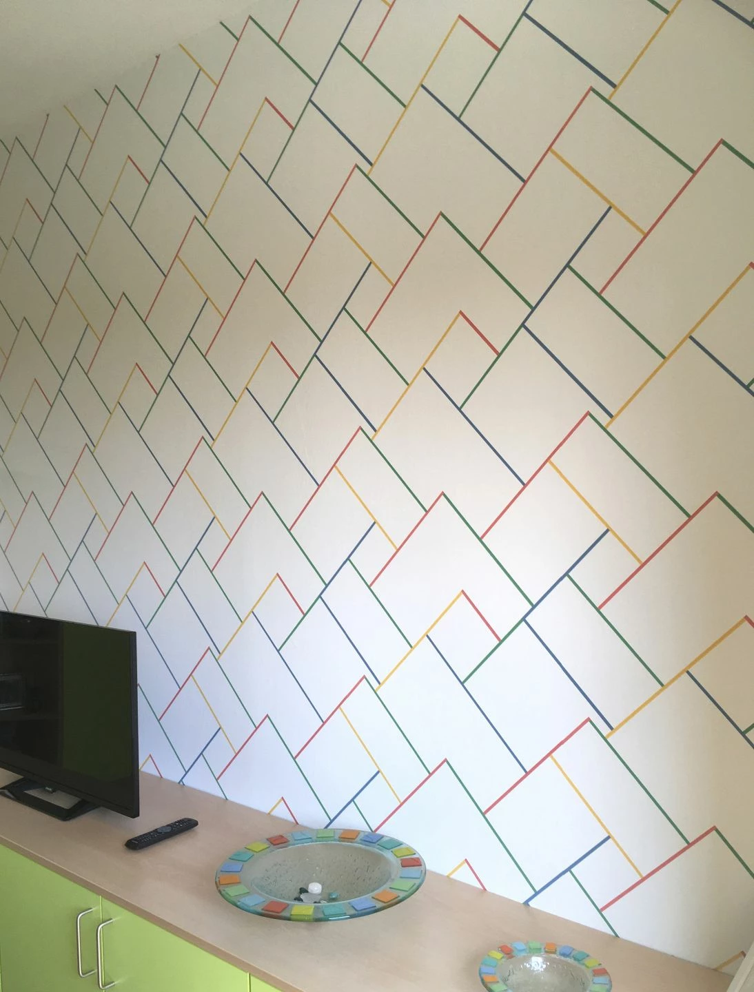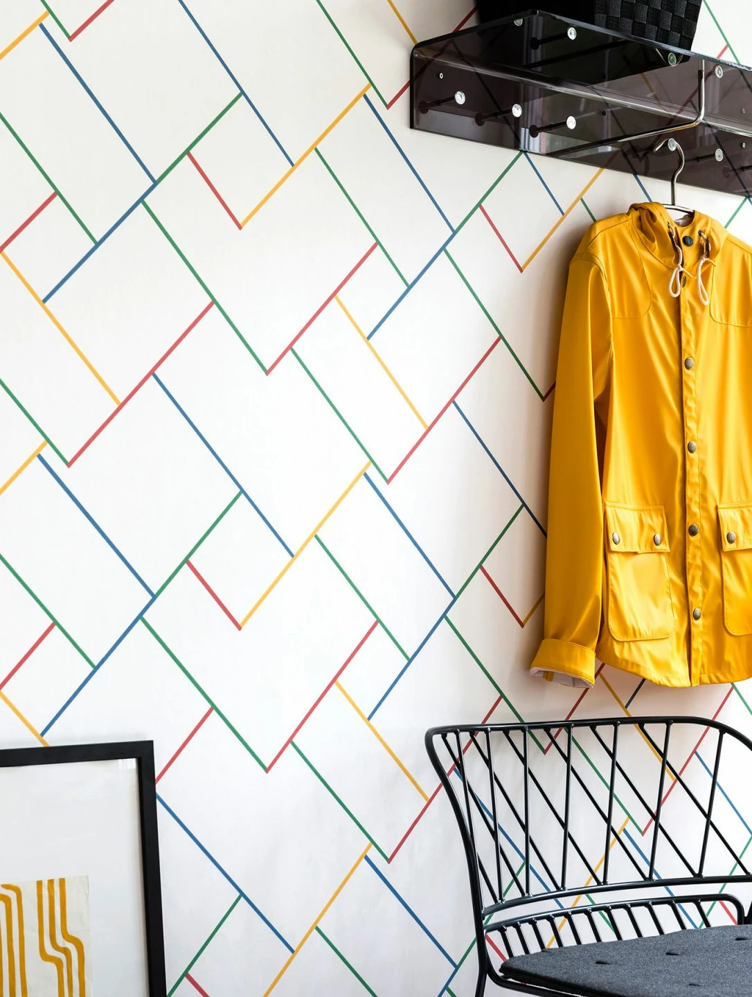 Frech in den Grundfarben Blau, Gelb, Grün, Rot und mit ungebremstem Tatendrang will dieses Geometriekunststück den Kreativraum erobern. Durch die geschickte Anordnung der farbigen Linien entsteht eine rasante optische Bewegung, die jeden mitreißt. Lassen Sie die Wand beben mit der leicht anzubringenden Vliestapete in matter Leimdruckoptik.
