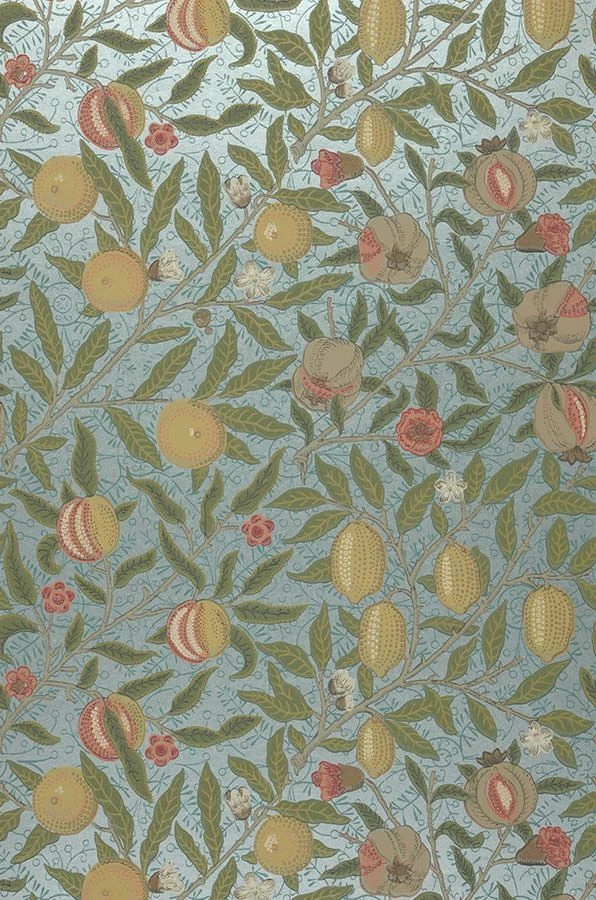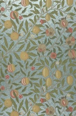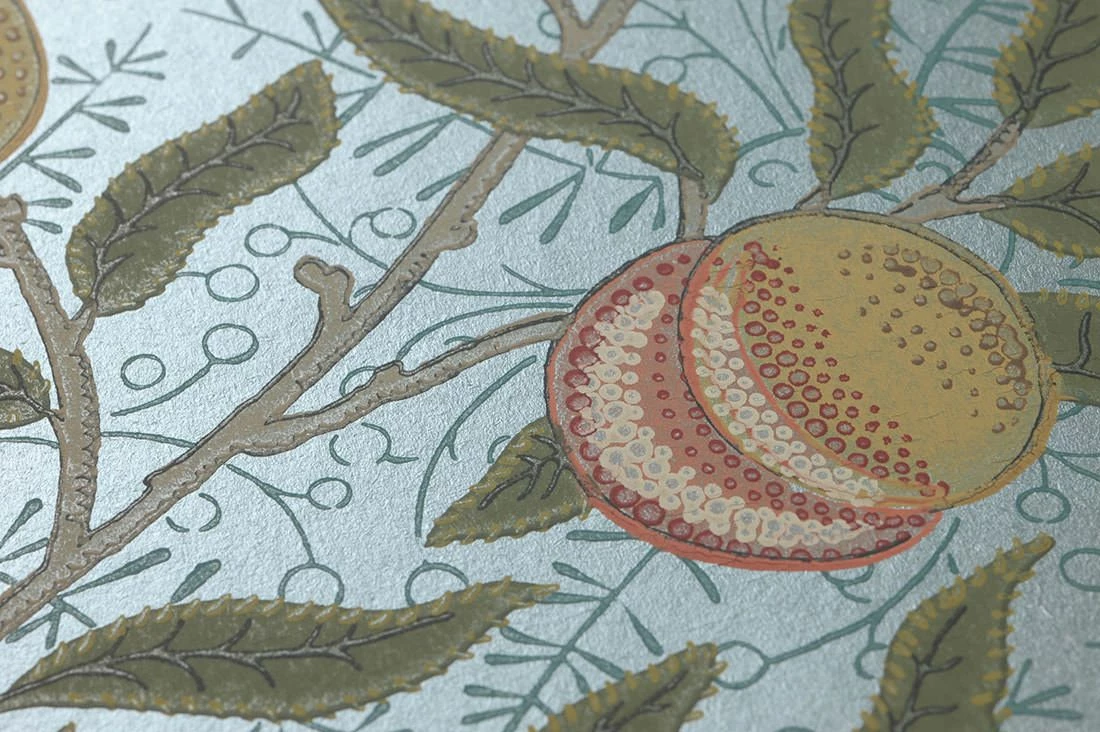 Saftige Früchte, Blätter und Blüten finden sich auf einem Untergrund, dessen pastelltürkise Farbe im Perlglanz schimmert. Die liebevoll gearbeiteten Details lassen die Früchte bei aller Stilisiertheit, die dem Jugendstil eigen ist, fast echt wirken. Das historische Design der Papiertapete erinnert an die Tapeten und Stoffe des britischen Designers William Morris.
