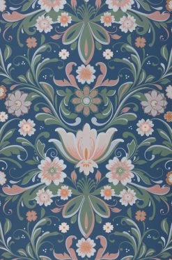 Ein klassisches Muster aus kunstvoll gemalten Blüten und Blattranken, die den azurblauen Grund der Tapete fast ganz ausfüllen, schmückt jeden Raum mit seiner zeitlosen Eleganz. Das florale Design kommt mit wenigen hellen Rosa- und Orangetönen, Zartblau und Resedagrün aus, die die Blüten und Blätter zu einem harmonischen Gesamteindruck werden lassen. Bis ins kleinste Detail ausgearbeitet sind die zarten Muster der Blumen.
