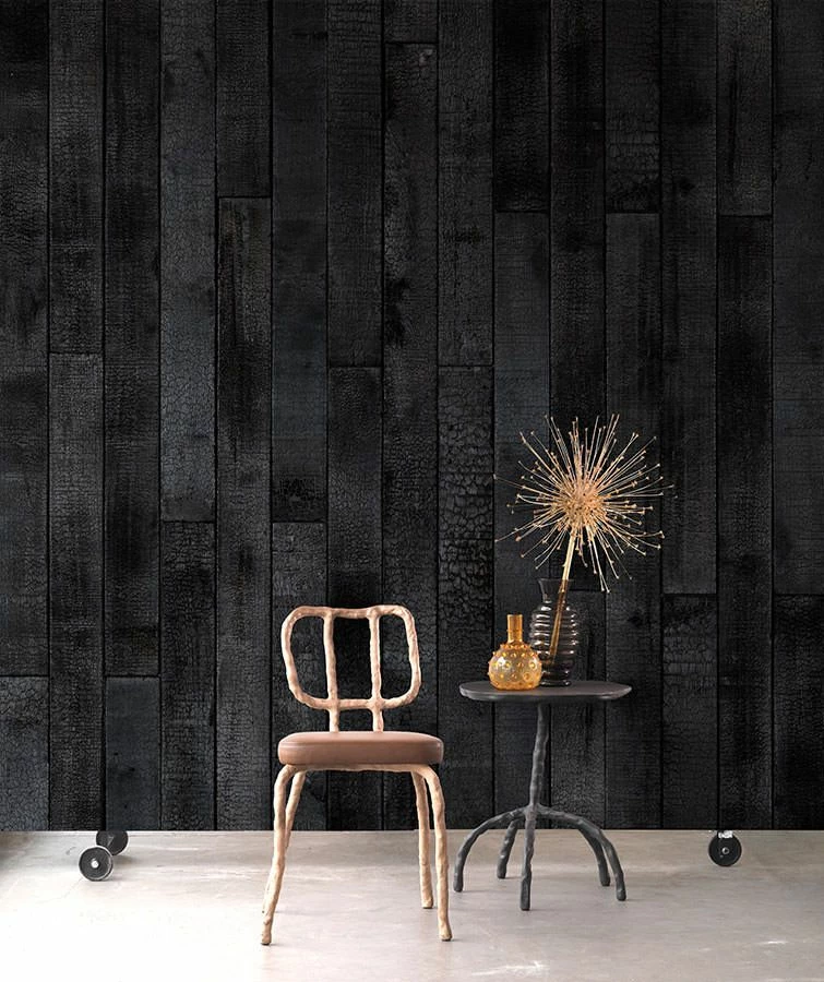 Schwarz, unergründlich und tief wie die Nacht – NLXL Tapetendesign erhebt verkohlte Bretter zur magischen Raumkunst. Die unverwüstliche Holzstruktur bleibt markant erhalten und lässt Schwarz in vielen Lichtnuancen glänzen. Die matte Optik der Holzimitat Tapete unterstützt den täuschend echten Look fantastisch.