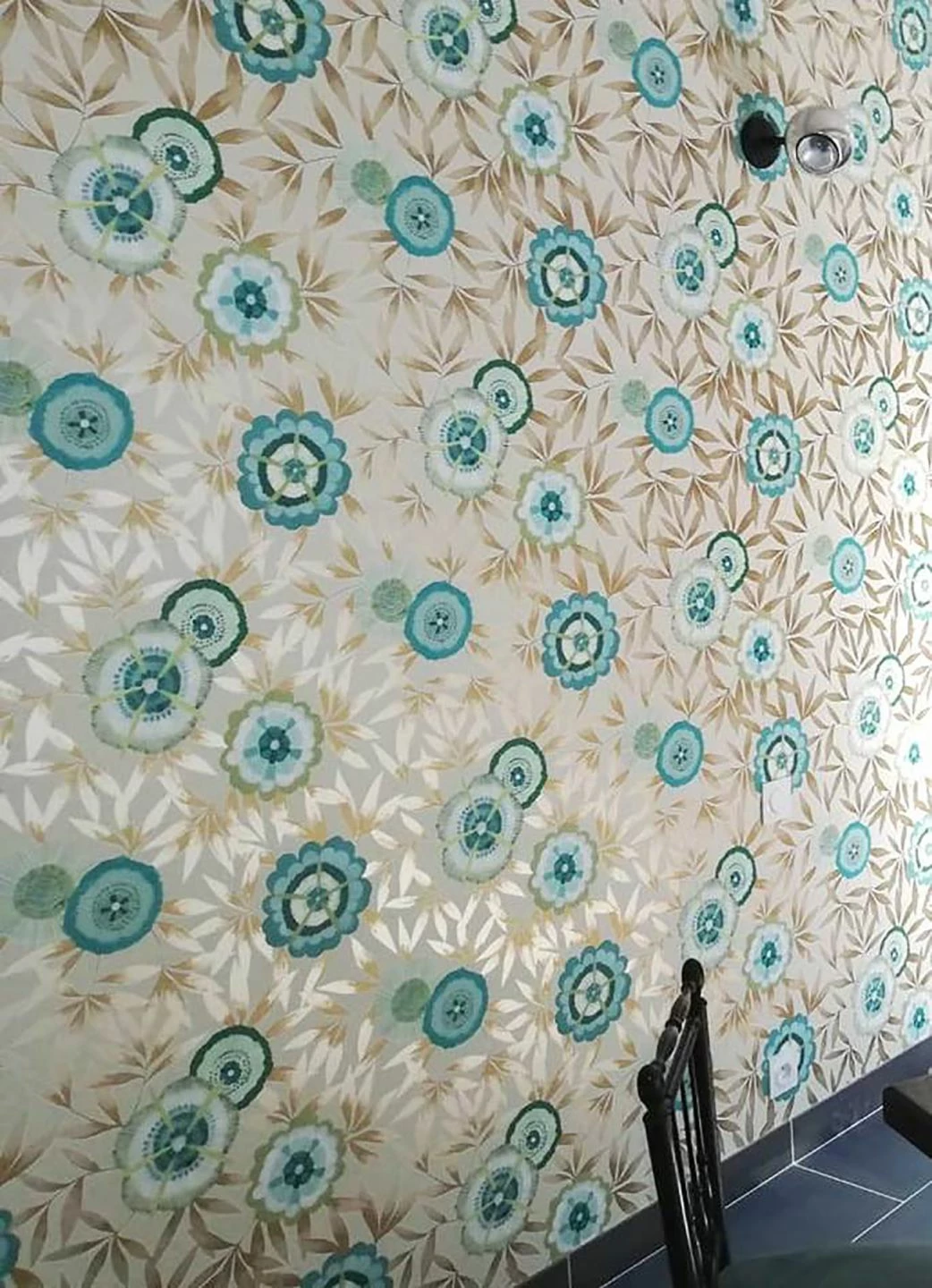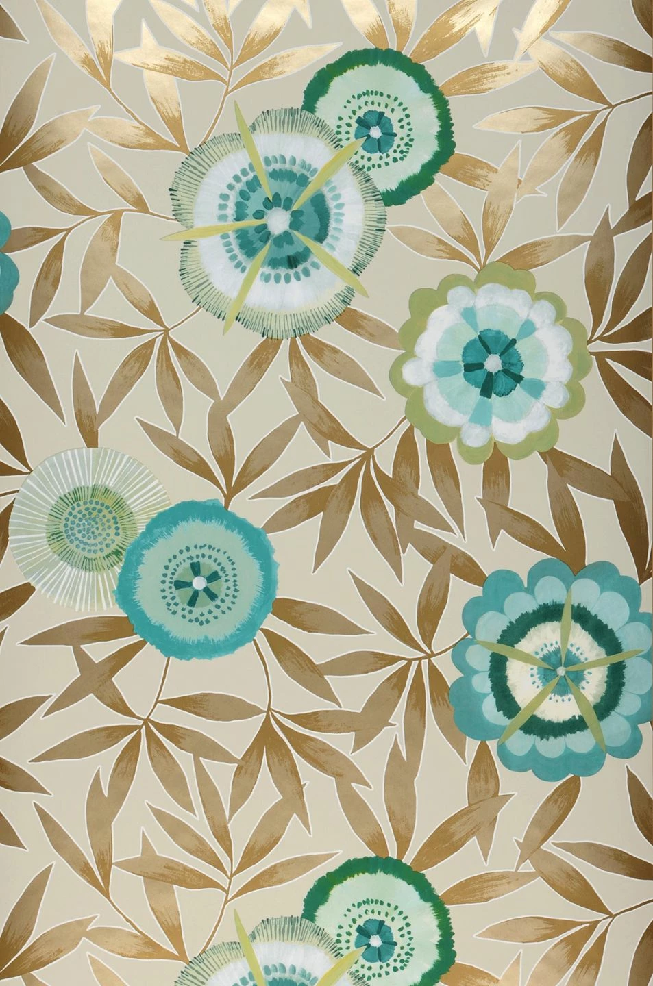 Cremeweiß sorgt für einen unwiderstehlichen Goldglanz und bringt die Spritzigkeit der Aquatöne auf den Punkt. Das stilisierte Blüten-Blätter-Arrangement beweist glamouröse Romantik in einer sehr modernen Form. Die waschbeständige Oberfläche erlaubt eine feuchte Reinigung.