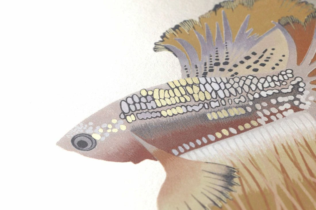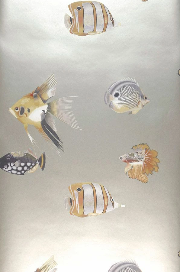 Tauchen Sie ab und ein. Die beruhigende Magie von zauberhaft gemusterten Fischen im silbernen Traumsee bietet sich für extravagante moderne Bad-Gestaltung an. Die scheinbare Synchronität wird durch einige Fische, die in entgegengesetzter Richtung schwimmen, unterbrochen. Lichteinfall erzeugt eine wohltuende Bewegung.