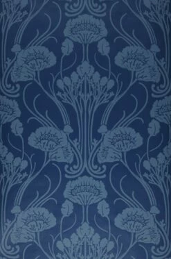 Der angenehm geringe Kontrast zwischen dem Dunkelblau des Hintergrunds und dem blaugrauen Muster macht die besondere Atmosphäre aus, die von dieser Vliestapete ausgeht. Aus den ruhigen Blautönen schöpft das klassische Jugendstil-Muster aus stilisierten Blüten, Blättern und ineinander verschlungenen Stängeln seine Ausdrucksstärke. Durch den besonders satten Farbauftrag des Leimdrucks bildet das Muster eine fühlbar erhabene Struktur auf dem matten Untergrund.