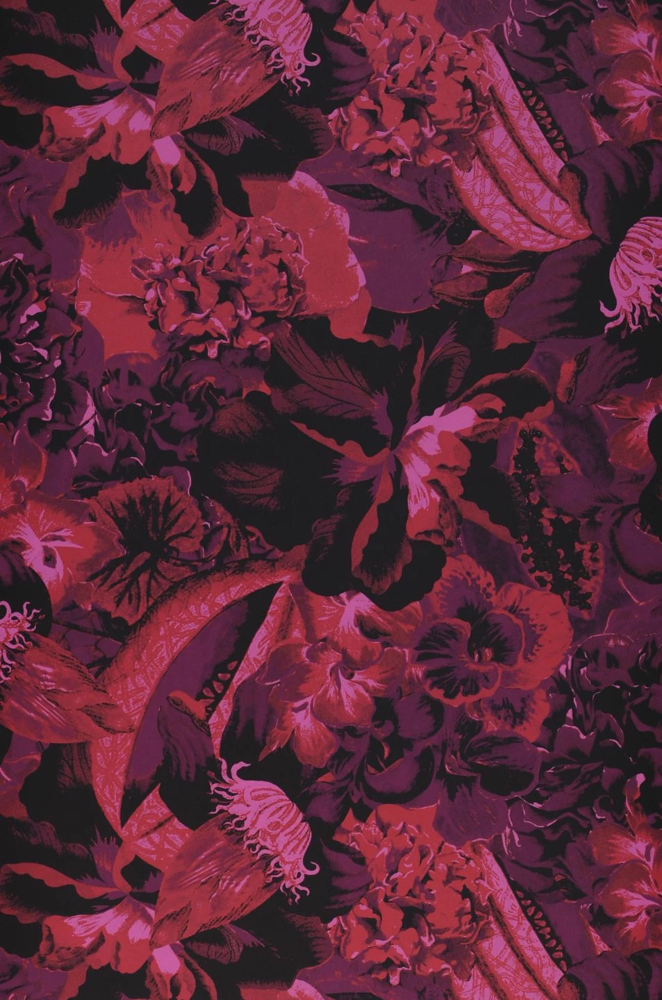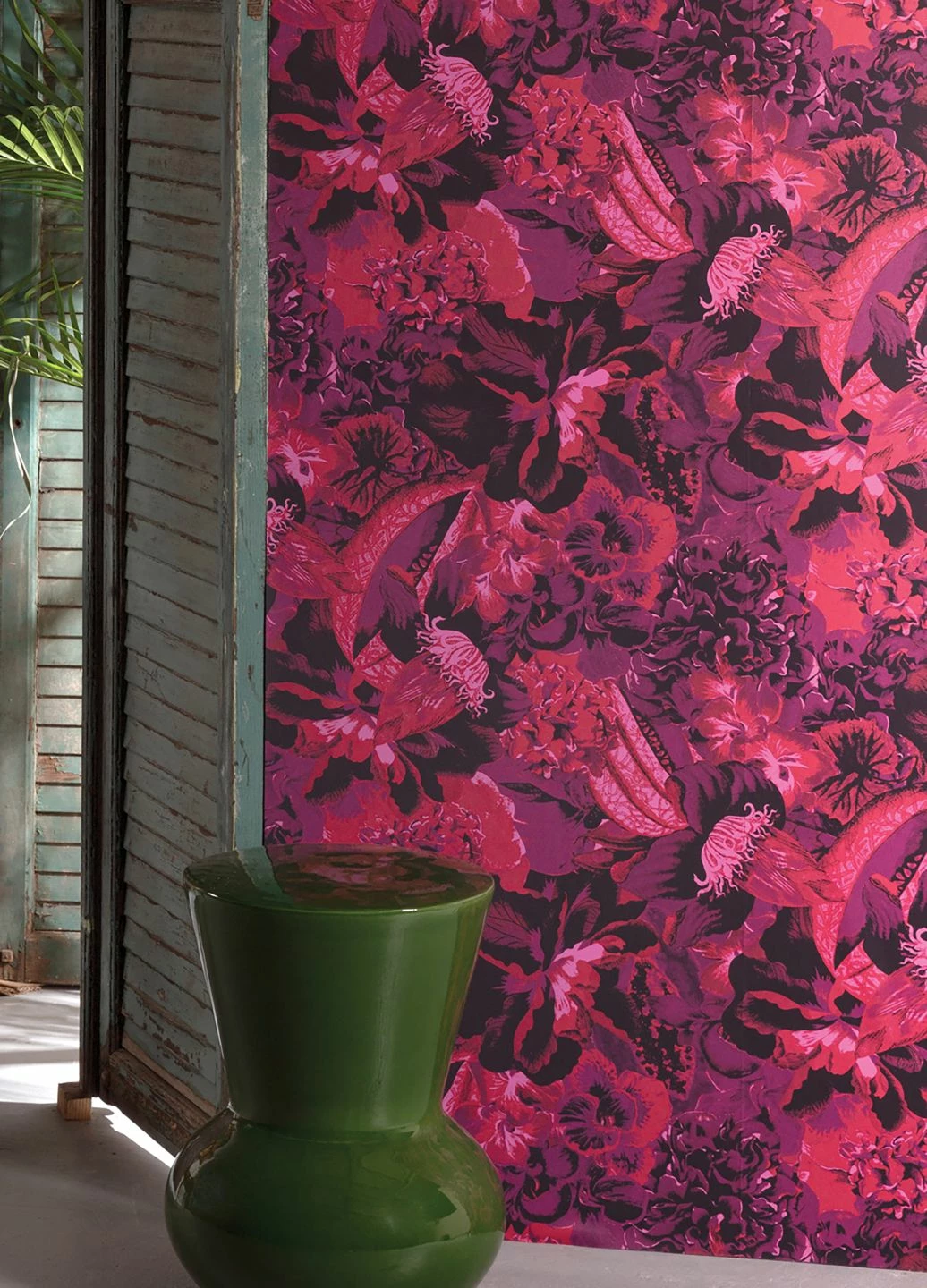 Leuchtende Nuancen verschiedener Violetttöne über Rot bis hin zu Schwarz als wirkungsvollem Kontrast unterstützen die exotische Anmutung der schwungvoll geformten Blüten und Blätter auf der Vliestapete Silvam. Die Auswahl der intensiven Farben gibt der lebhaften, warmen Tapete inneren Zusammenhalt. Das moderne, außergewöhnliche Blumendesign setzt einen ausdrucksstarken Akzent in Verbindung mit schwarzen Möbeln.