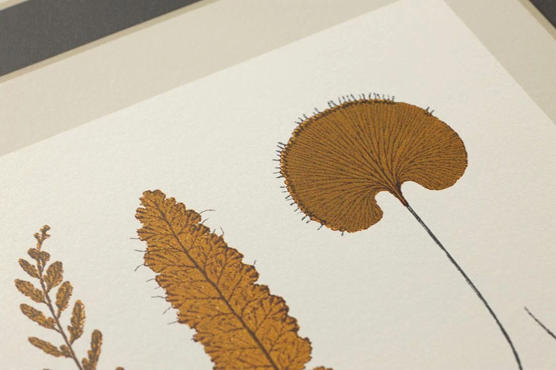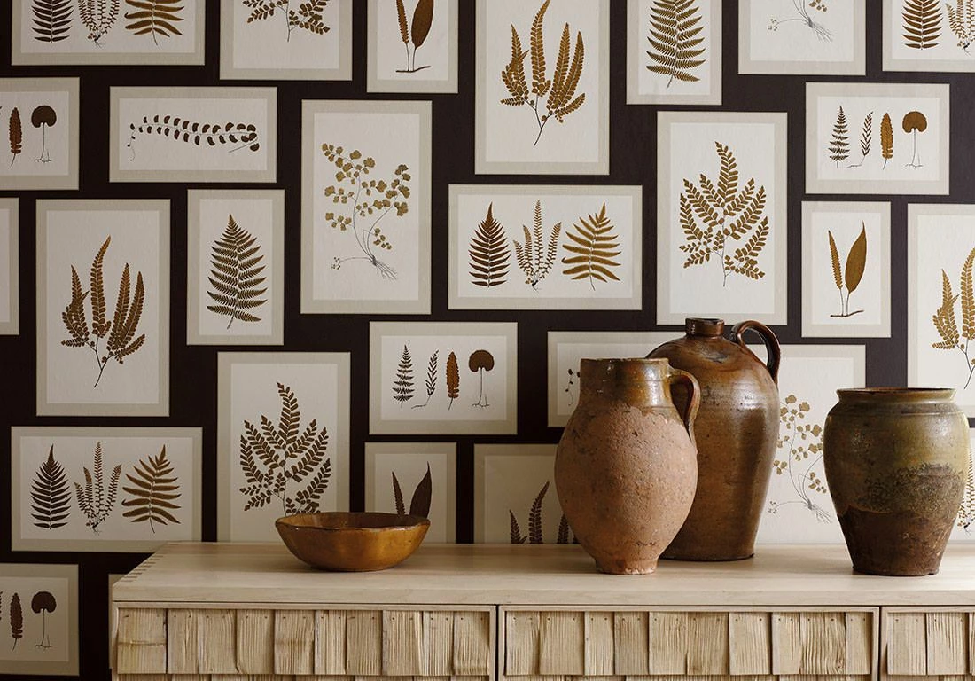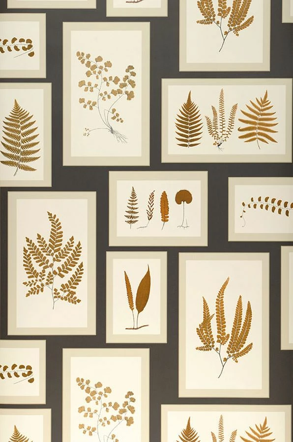Bilderrahmen mit weißer Grundfläche und blass graubeigefarbenem Passepartout, angeordnet auf schwarzgrauem Hintergrund, präsentieren die ganze Vielfalt zierlich geformter Farnblätter. Wie eine botanische Sammlung in einem Naturkundemuseum wirkt Ihr Raum seriös, aber gleichzeitig durch die Vielzahl der Blattformen und die Struktur der Rahmen aufgelockert, und lädt dazu ein, die abgebildeten Pflanzen zu bewundern.