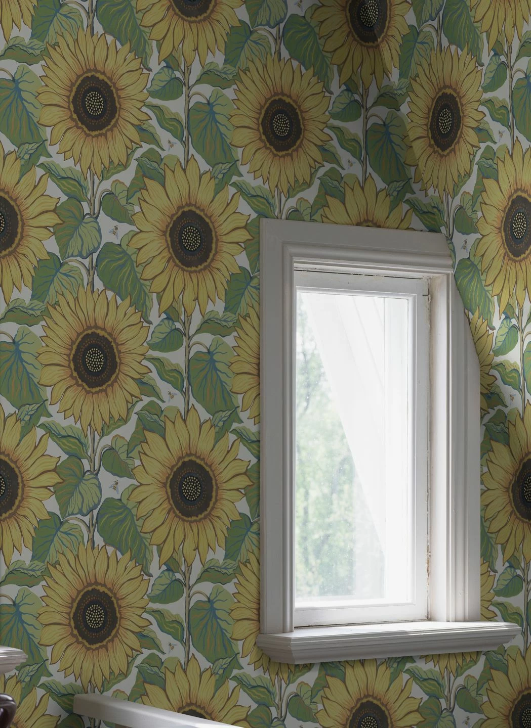 Welche Blume symbolisiert die lebensspendende Kraft des Sommers mehr als die Sonnenblume? Dicht an dicht bedecken die großen, strahlenden Blüten, schön gezeichnet in Gelb mit Beige-, Braun und Orangetönen, den weißen Untergrund. Auch die Blätter sind ein echter Hingucker mit ihren Adern in Gelb und Blau. Interessante Details bieten die Insekten, die zwischen den großen Blumen hin und her schwirren. Mit Siwa holen Sie den Sonnenschein in Ihr Zuhause.