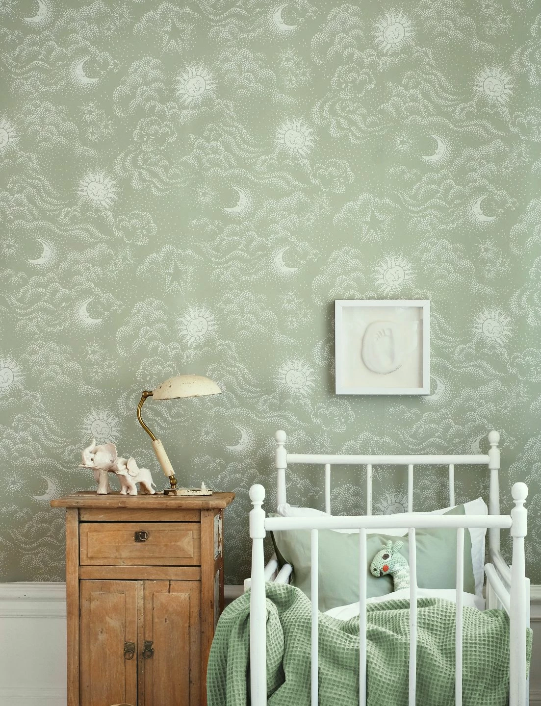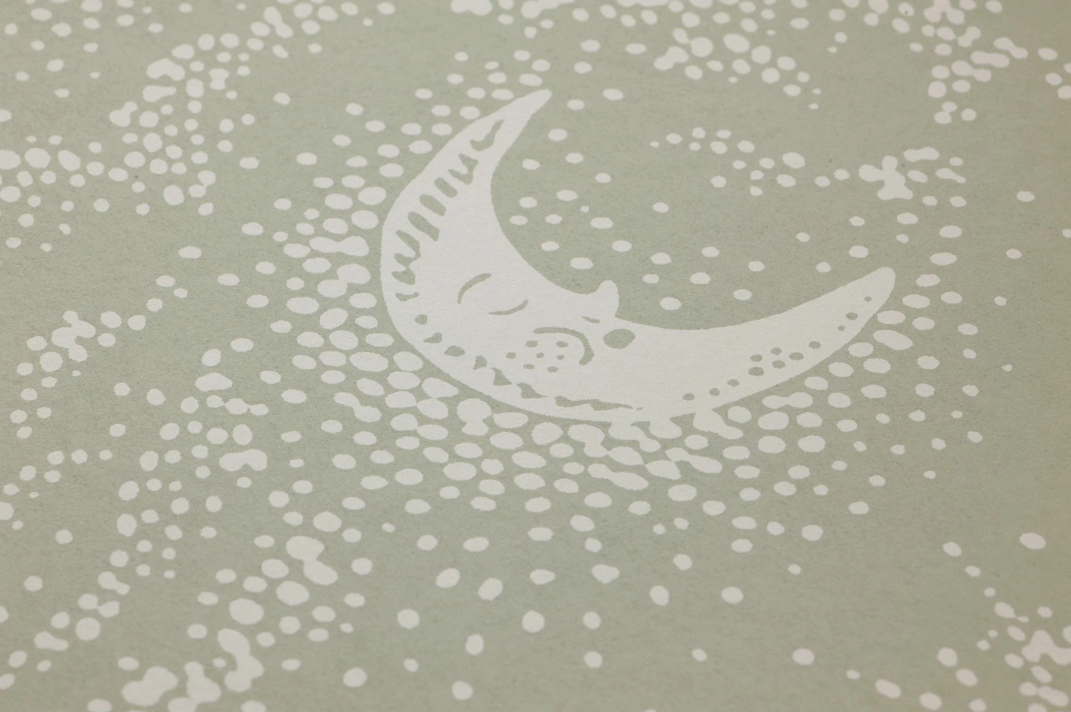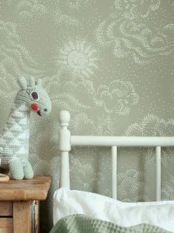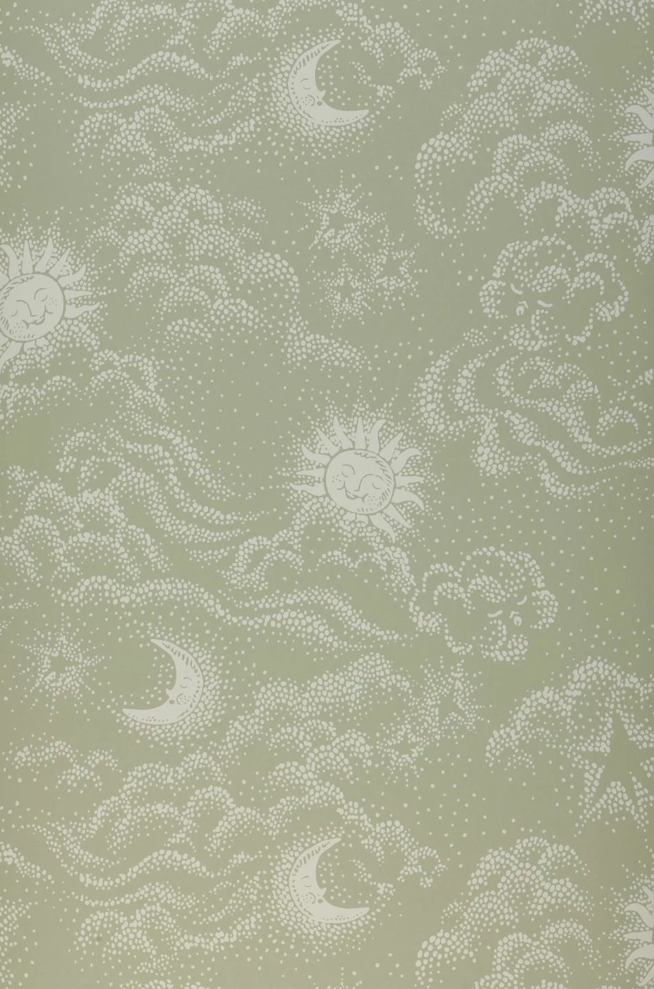 Sonne, Mond und Sterne bewachen den Schlaf Ihres Kindes auf der zauberhaften Kinderzimmertapete Sky Dreams. Die freundlich lächelnde Sonne, der friedlich schlummernde Mond, Sterne und Wolken, die nur mit Punkten angedeutet sind, spannen im Kinderzimmer das Himmelszelt auf. Die schilfgrüne Grundfarbe in Verbindung mit dem grauweißen Muster lässt die Tapete dabei eine beruhigende Wirkung verströmen.
