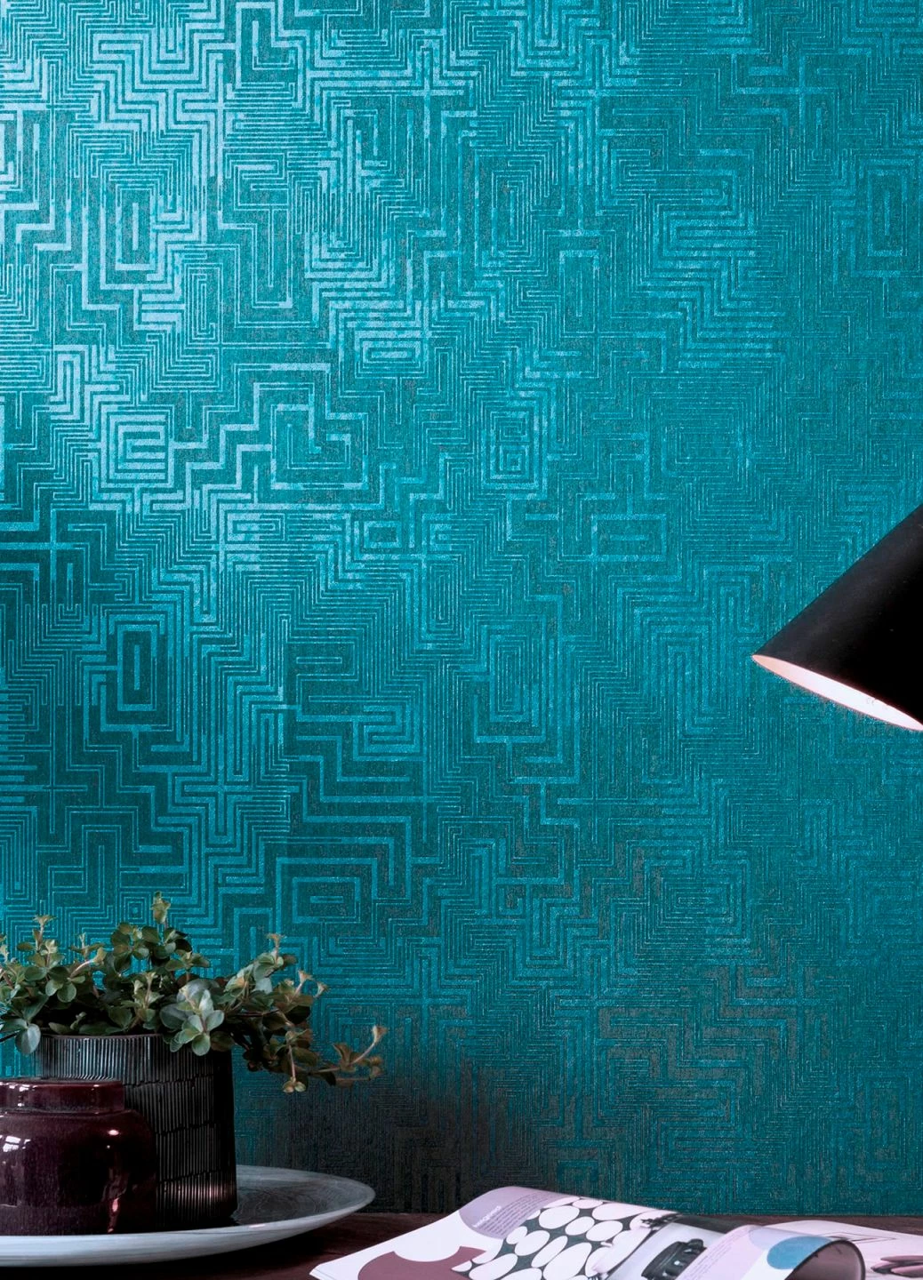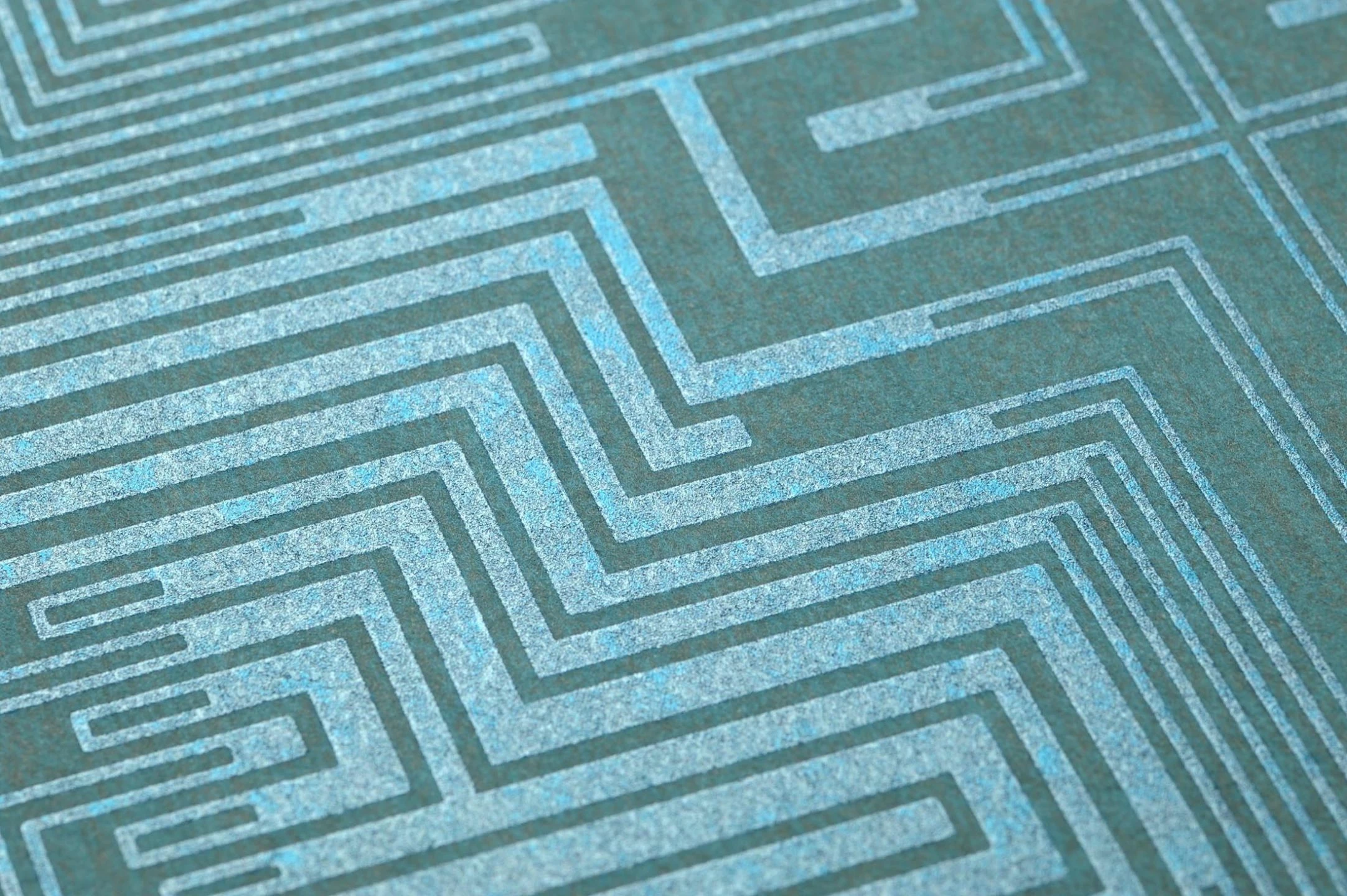 Verschieden breite Streifen und Winkel in Blau- und Türkistönen, die an die Farben des Wassers erinnern, verbinden sich zu einem Gesamtbild klarer geometrischer Formen. Der besondere Reiz der Vliestapete liegt im Zusammenspiel des schimmernden Wasserblau mit den matten Streifen in Pastelltürkis und Schilfgrün. Das Licht, das vom Fenster oder von künstlichen Lichtquellen auf die Tapete fällt, erzeugt angenehme Reflexe und einen lebendigen Eindruck.