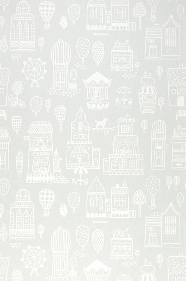 Themenwelten für Kinder bestimmen die Handschrift des Tapetenlabels Majvillan. Die kleine Stadt mit kindgerecht grafisch umgesetzten Häusern, Gebäuden, Bäumen ist auf der grau-weißen Farbvariante mit Elementen vom Jahrmarkt gespickt. Karussell, Riesenrad, Heißluftballon verwandeln die Stadt in eine Erlebnisstadt.