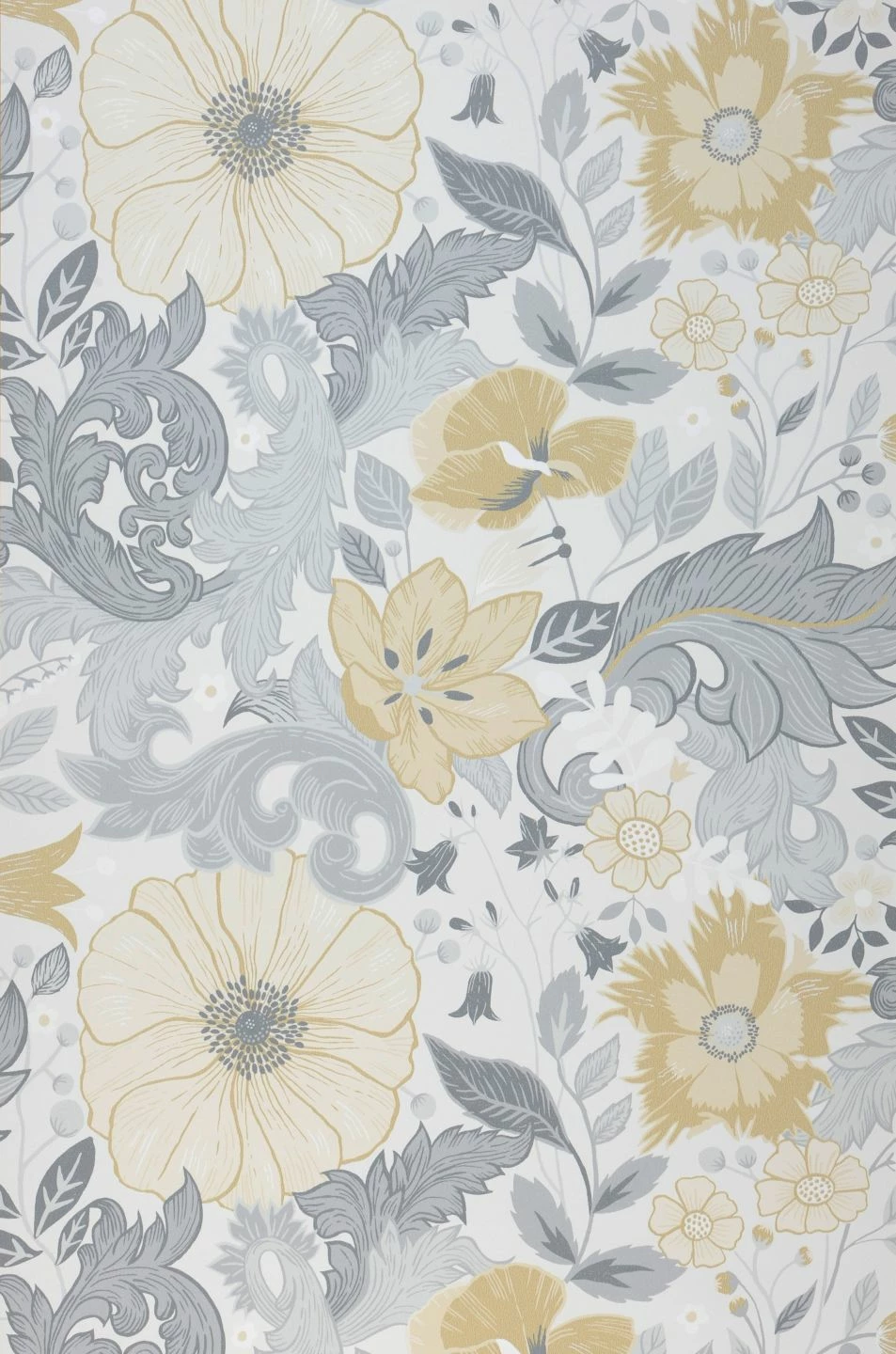 Zwischen dem weißen Untergrund und den in Grautönen gehaltenen Blumen und Blattranken leuchten große Blüten in Ocker und Cremeweiß hervor und setzen wirkungsvolle Akzente. Der Kontrast der beiden Farbfamilien setzt die Vielfalt der Blütenformen gekonnt in Szene, während die Beschränkung auf lichte Grau- und Ockertöne Helligkeit und ruhigen Zusammenhalt beisteuert. Ein elegantes Wohnzimmer oder ein Schlafzimmer zum Ausspannen gewinnen mit „Smilla“ individuellen Charakter.