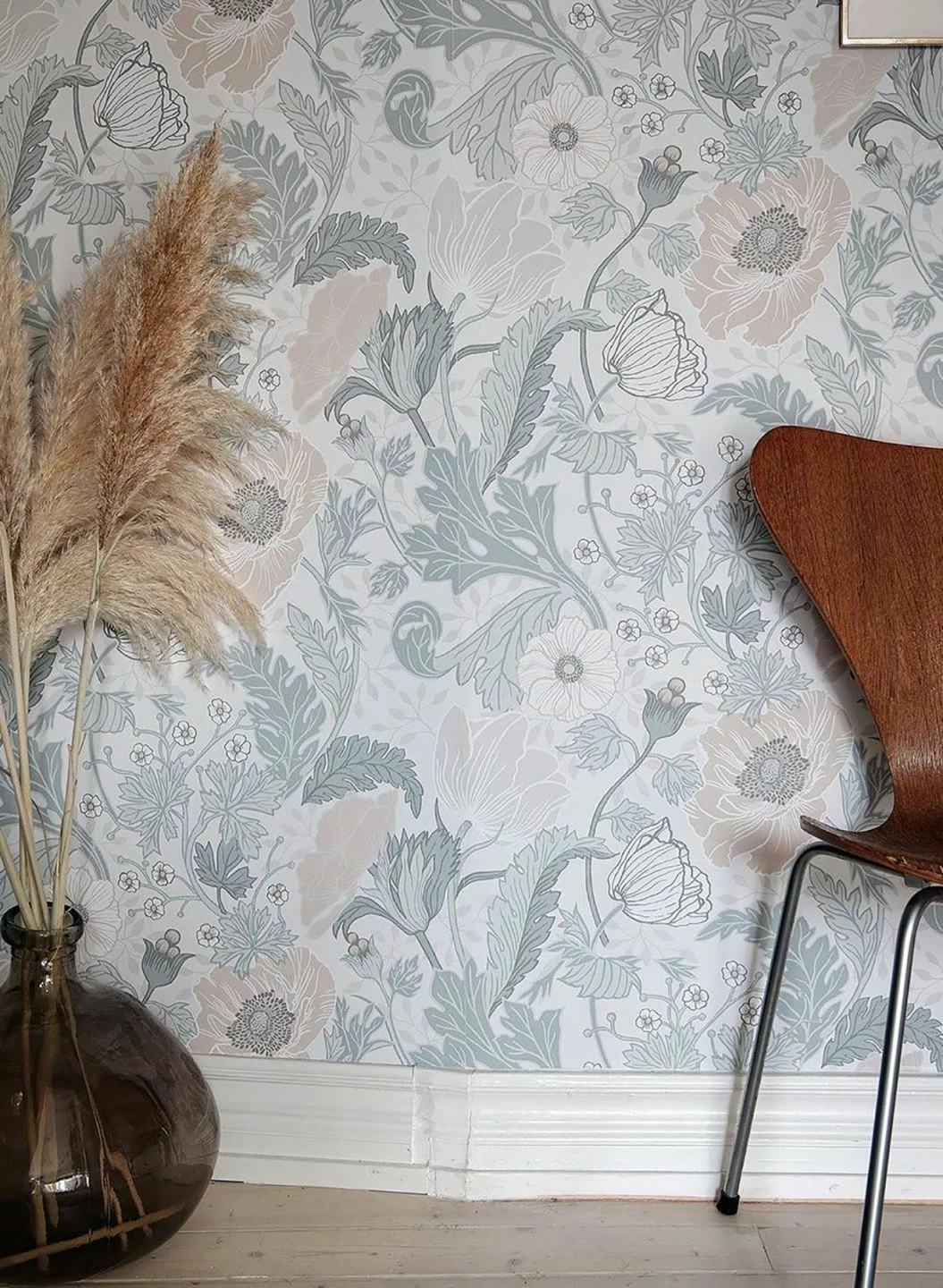 Eine schier überbordende Fülle von Blumen und Blättern zieren dicht an dicht die Vliestapete „Soria“. Die Formenvielfalt der Pflanzen macht die Tapete so lebendig. Die Konzentration auf verschiedene Nuancen von hellen Grautönen – von Grüngrau über Hellgrau bis Mintgrau – und wenige weitere lichte Farben verleiht Ihren Wänden eine unvergleichliche Eleganz.