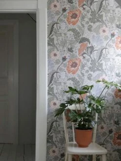 Auf grauweißem Fond entwickeln sich die Blumenranken und Blütenköpfe in Grautönen, Oliv und Orange zu einer fröhlichen Wandinszenierung, die mitreißt und für endlos gute Laune sorgt. Weiße Möbel, echte Grünpflanzen und romantische Landhaus-Accessoires ergänzen das harmonische Bild.