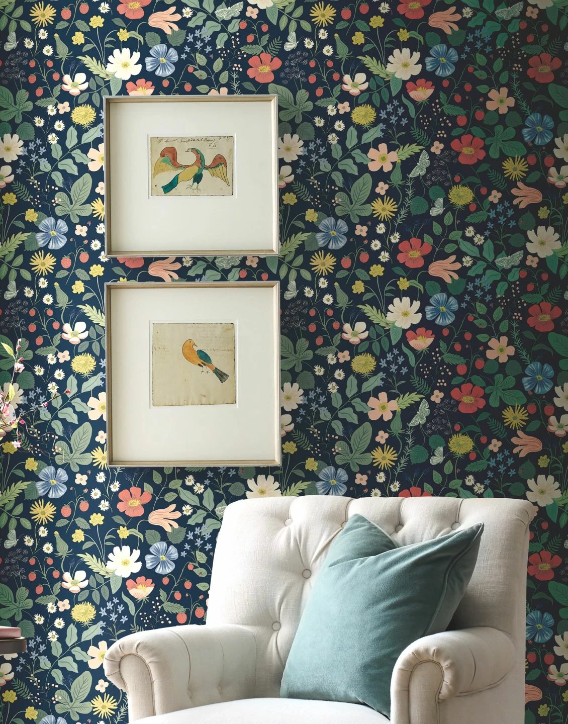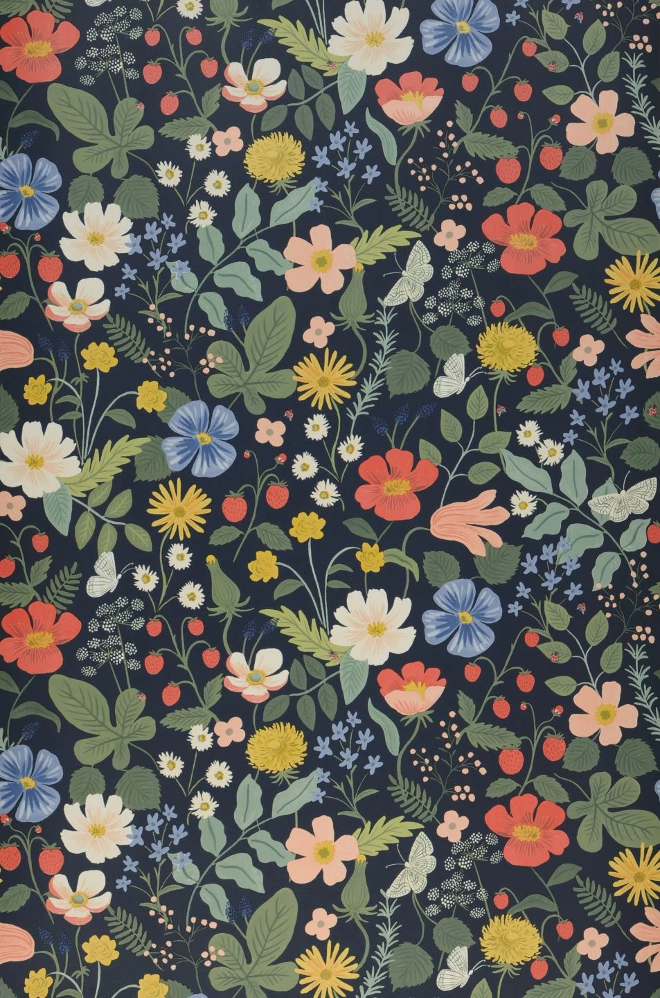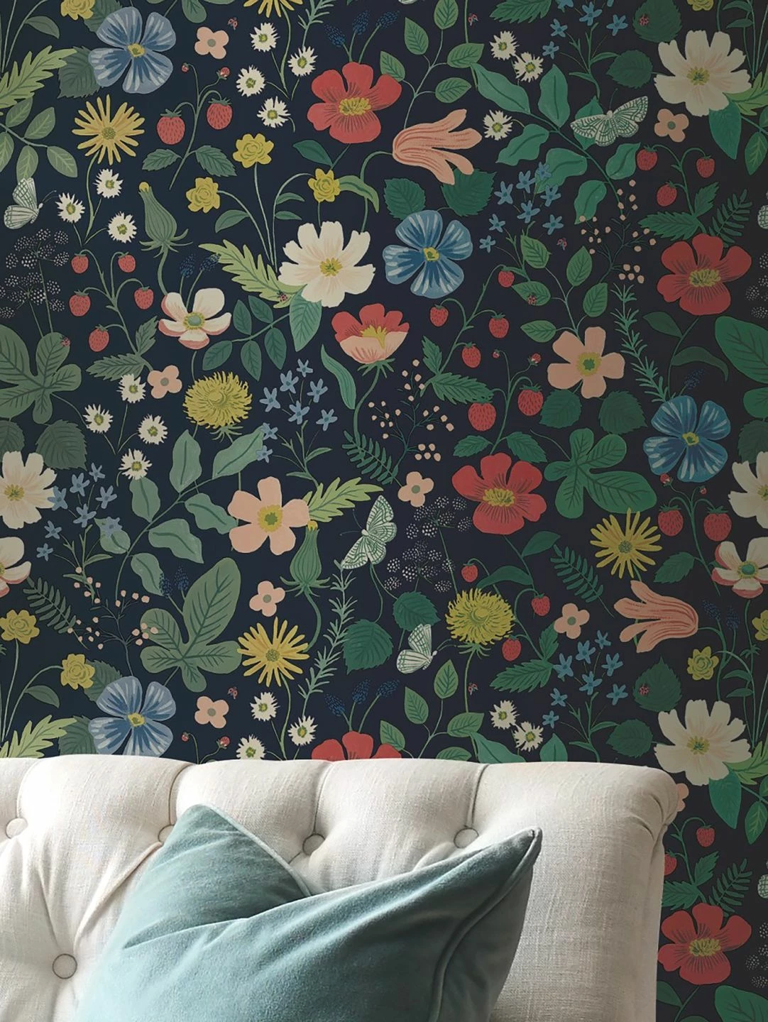 Kräftige, bunte Blütenfarben heben die unterschiedlichsten Blumen, die reifen Erdbeeren und die Schmetterlinge vom stahlblauen Untergrund ab und lassen sie leuchten. Löwenzahn und Butterblumen, Vergissmeinnicht und Gänseblümchen – die ganze Vielfalt des Sommers zieht mit der Papiertapete von Rifle Paper bei Ihnen ein. Sie schafft einen starken, kontrastreichen Hintergrund gerade für den skandinavischen oder den Landhaus-Stil.