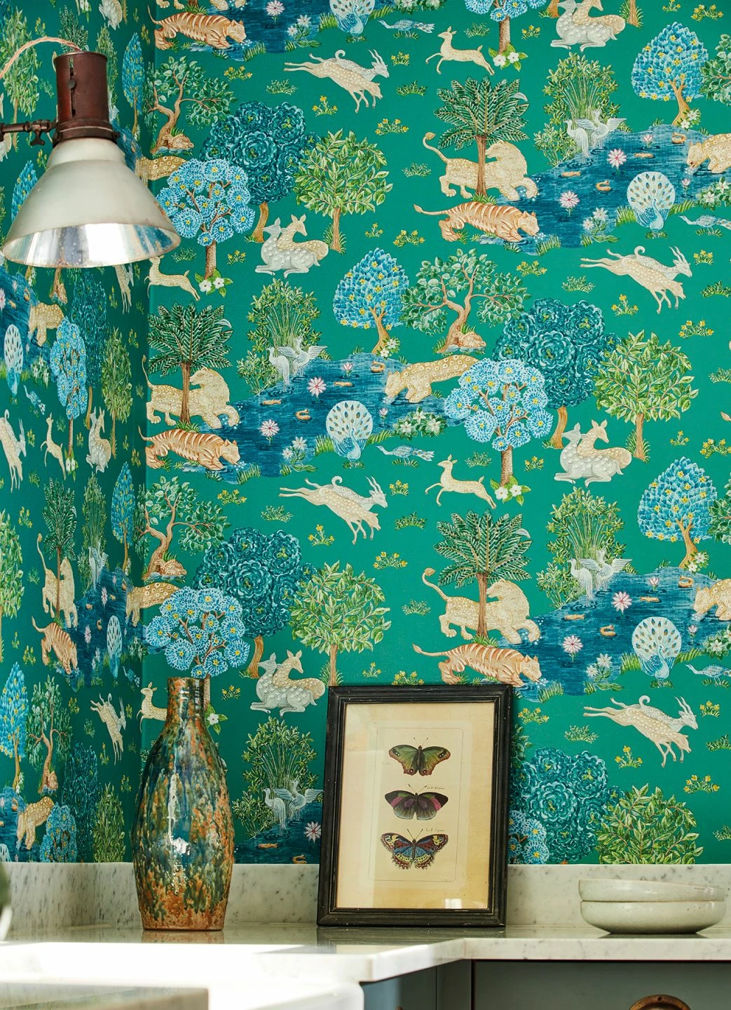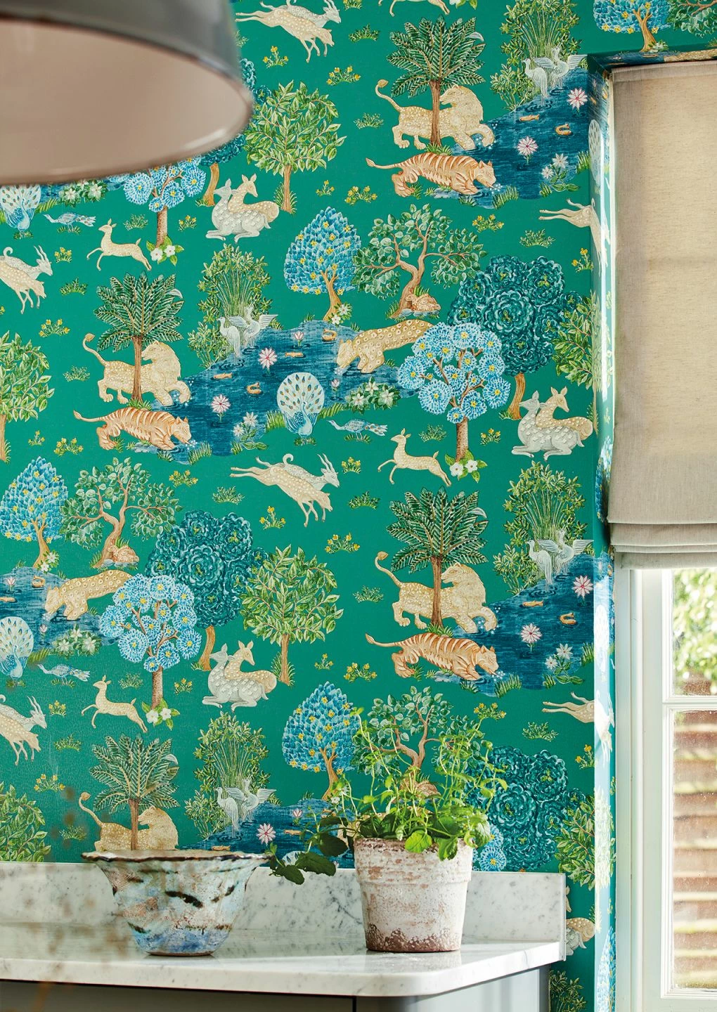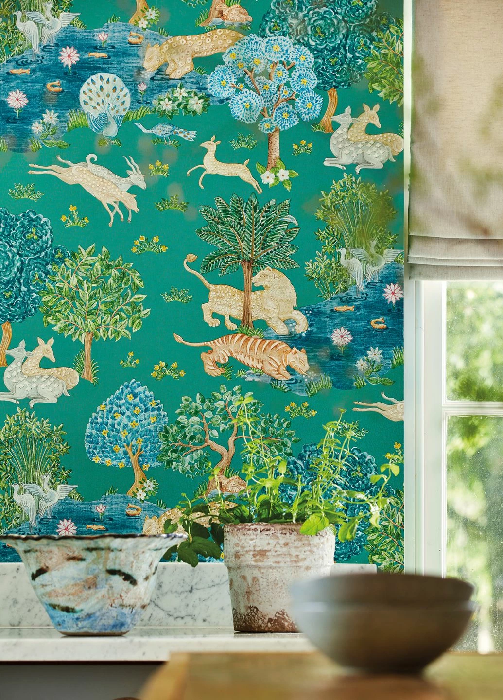 Blühende Bäume, Teiche voller Lotusblüten, zierliche Antilopen, Pfauen und friedliche Raubkatzen – die Szene, die die Vliestapete „Sumatra“ zeigt, mutet paradiesisch an. Der Stil der Darstellung erinnert an indische Malerei und zaubert einen Hauch von Exotik an Ihre Wände. Der Untergrund der Tapete ist in kräftigem Türkis gehalten, Perlgold setzt schimmernde Akzente. Kombiniert mit einer Wandfarbe aus dem Farbspektrum der Tapete, kommt „Sumatra“ besonders schön zur Geltung.