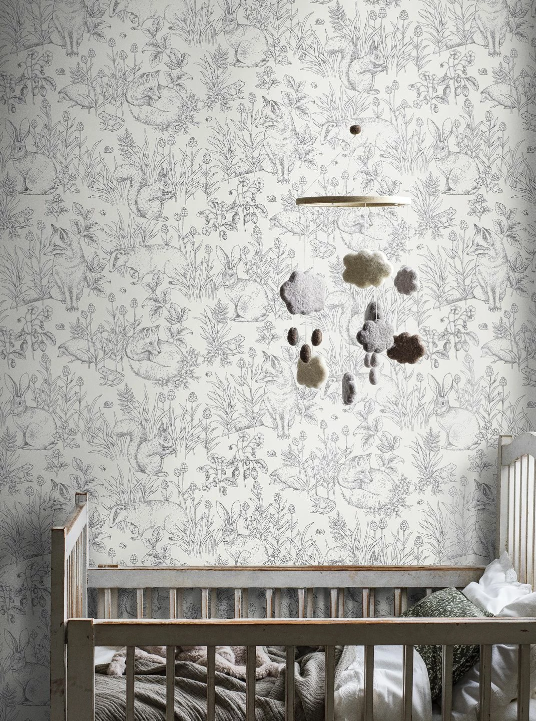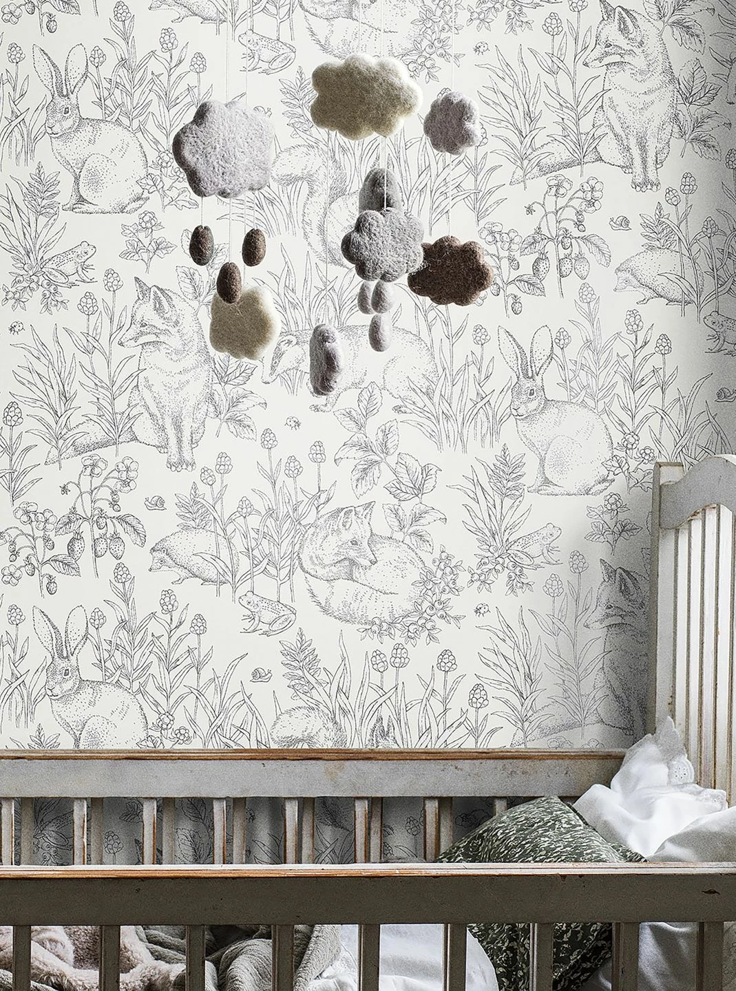 Kleine und große Tierfreunde werden ihre Freude an dieser Tapete haben: Mit ihren detailgetreuen Zeichnungen von einheimischen Tieren verschönert Sumi ein Kinderzimmer ebenso wirkungsvoll wie ein Wohn- oder Schlafzimmer zum Beispiel im skandinavischen Stil. In Anthrazit auf hellem Grauweiß, wie mit dem Bleistift gezeichnet, finden sich Hasen und Füchse, Eichhörnchen und Igel, Frösche und Dachse inmitten von Gräsern und Blumen und laden dazu ein, genauer hinzusehen.