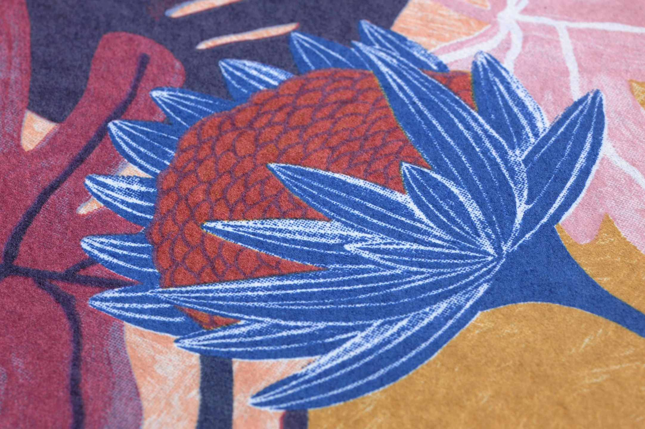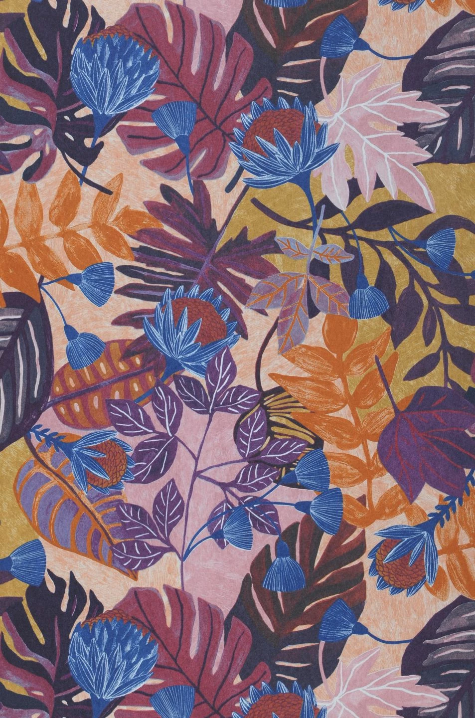 Unheimlich kunstvoll und wie handgemalt sind die Formen und Farben der exotischen Blätter und Blüten, die auf der Vliestapete Sunago wie in einem undurchdringlichen Dschungel durcheinander wachsen. Die expressive Farbgebung aus verschiedensten Nuancen von Violett, ergänzt durch Blau, Hellrosa und Orangebraun, erzeugt einen eindrucksvollen Effekt. Selbst der Untergrund trägt durch leicht marmorierte Flächen in Lachs, Ockergelb und Pastellviolett zur Ausdruckskraft des Musters bei.