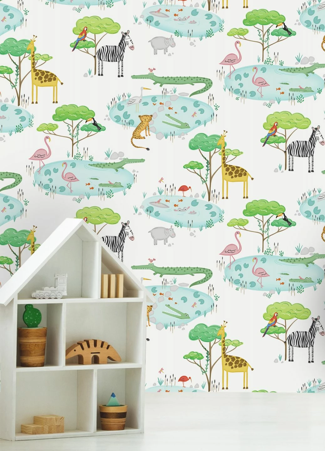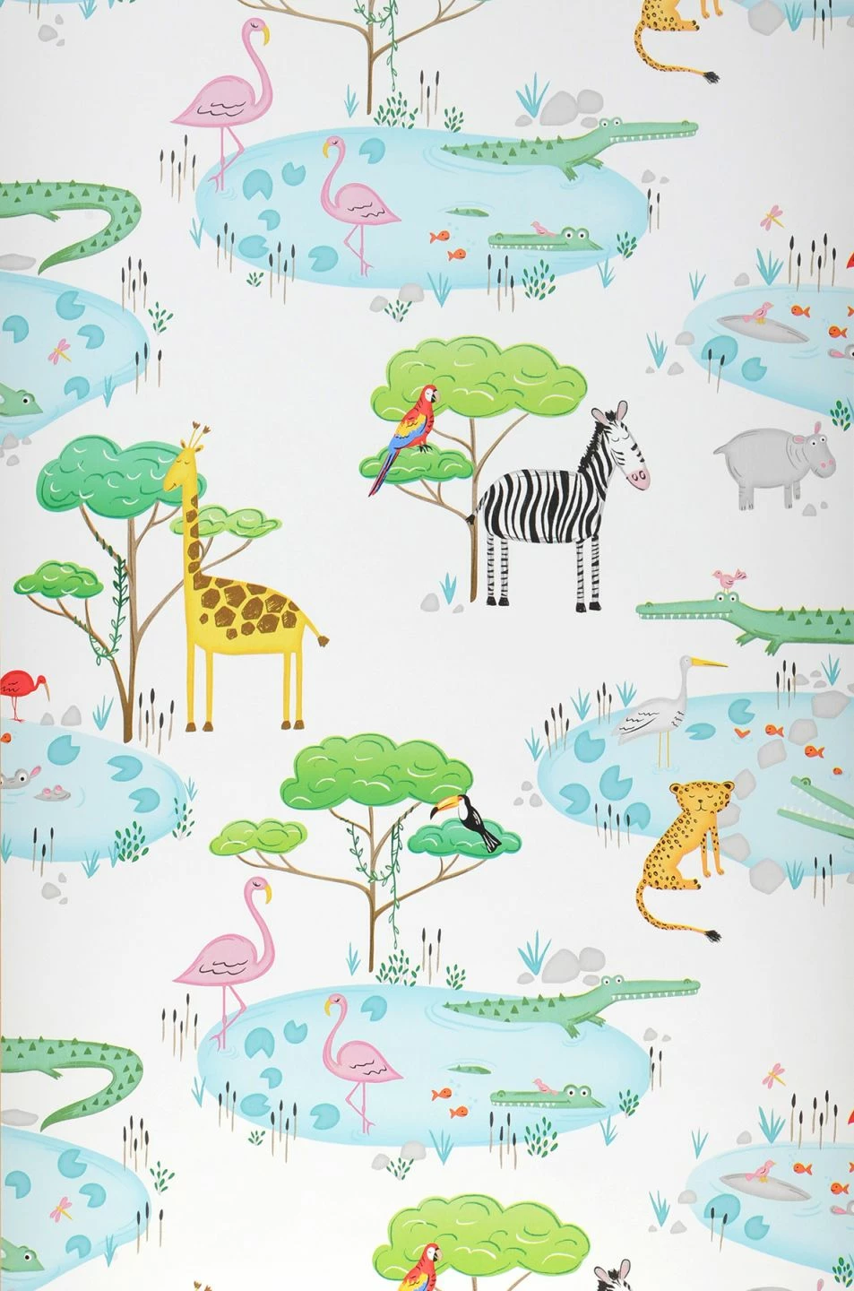 Irgendwo in einem tropischen Paradies tun sich diese Oasen mit wilden Tieren auf. Giraffe, Zebra, Flamingo, Krokodil, Tukan und viele weitere exotische Freunde tummeln sich am kleinen See und laden genau Dich ein, mitzuspielen. Die stimmungsvolle Mustertapete regt kindliche Fantasie in hohem Maße an und begeistert durch ihre sanften Pastelltöne.