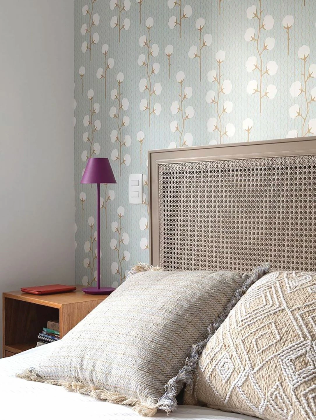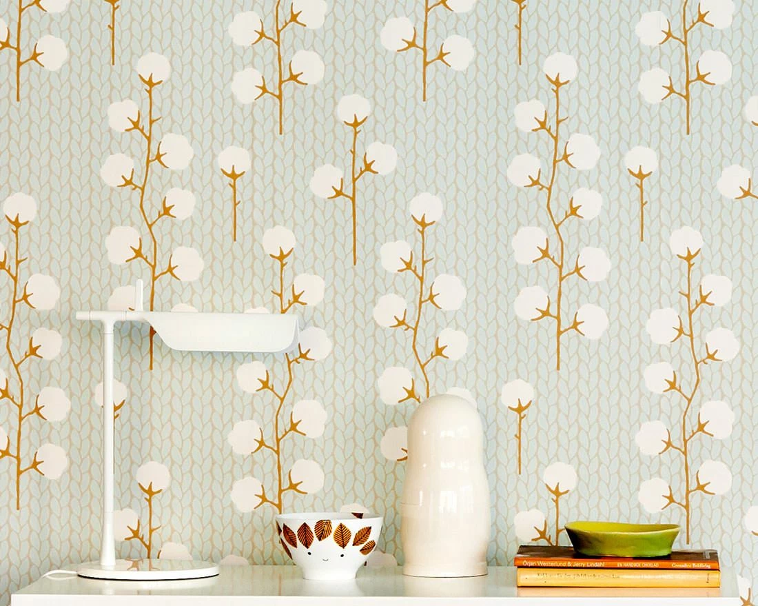 Die im Leimdruckverfahren hergestellte Tapete stammt von dem schwedischen Label Majvillan. Emporstrebende Baumwollpflanzen schmücken den Untergrund, der wie aus geflochtenen Zöpfen wirkt. Hier verbinden sich matte Türkistöne mit Brauntönen und Cremeweiß.