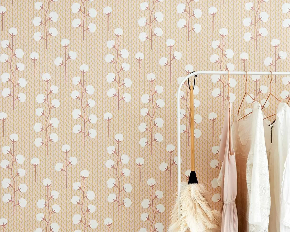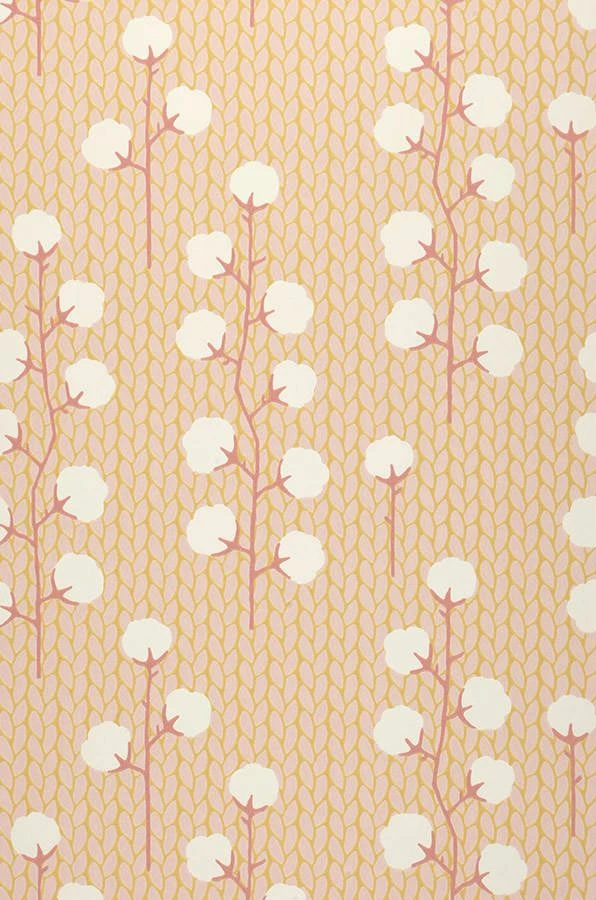 Die im Leimdruckverfahren hergestellte Tapete stammt von dem schwedischen Label Majvillan. Emporstrebende Baumwollpflanzen schmücken den Untergrund, der wie aus geflochtenen Zöpfen wirkt. Hier verbindet sich mattes Honiggelb mit Blassrosa, Braunrot und Cremeweiß.
