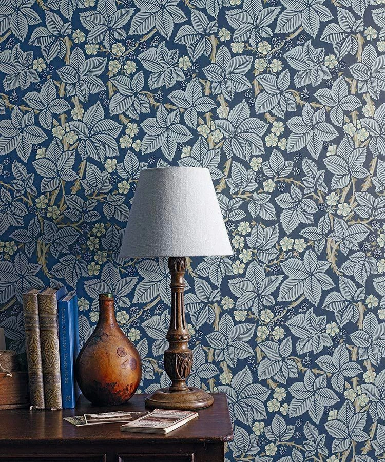 Ein Dickicht aus stilisierten Brombeerranken voller Blätter mit ihren ausgeprägten Blattadern, duftiger Blüten in hellem Elfenbein und dunkler reifer Beeren erstreckt sich über die Papiertapete aus dem Hause Morris & Co. Der historische Entwurf der englischen Künstlerin Kate Faulkner, einer Zeitgenossin von William Morris, zieht seine ausgeglichene Stimmung aus den vorherrschenden ruhigen Blautönen.